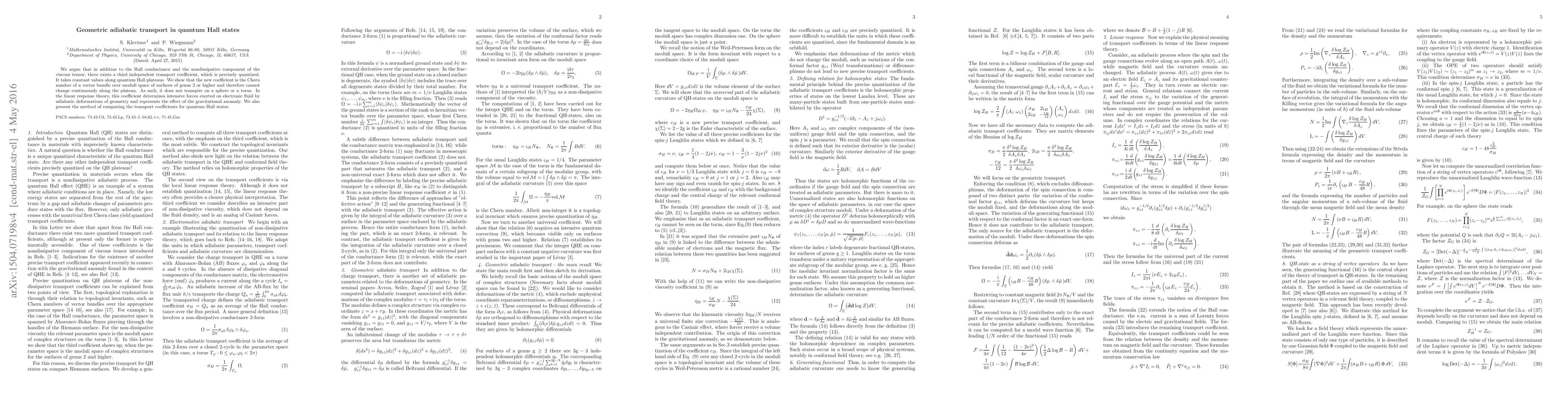 We argue that in addition to the Hall conductance and the nondissipative component of the viscous tensor, there exists a third independent transport coefficient, which is precisely quantized. It takes constant values along quantum Hall plateaus. We show that the new coefficient is the Chern number of a vector bundle over moduli space of surfaces of genus 2 or higher and therefore cannot change continuously along the plateau. As such, it does not transpire on a sphere or a torus. In the linear response theory, this coefficient determines intensive forces exerted on electronic fluid by adiabatic deformations of geometry and represents the effect of the gravitational anomaly. We also present the method of computing the transport coefficients for quantum Hall states.