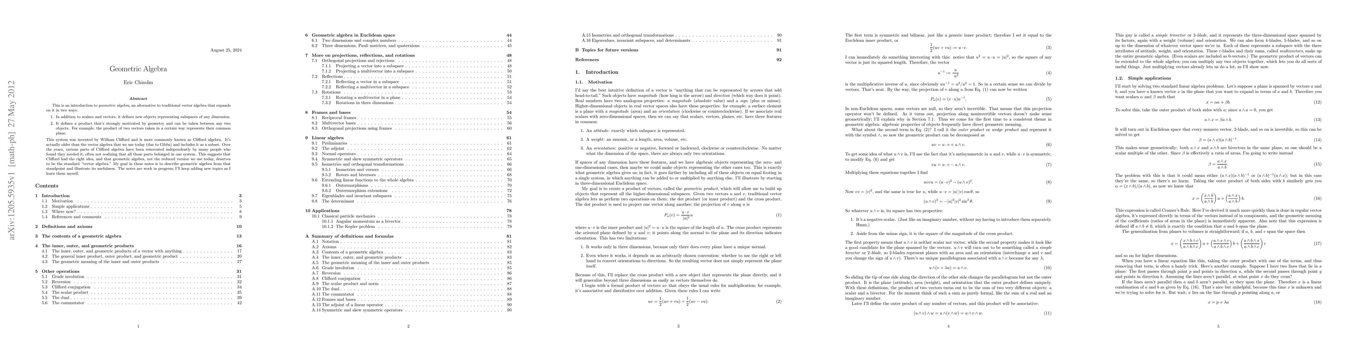 This is an introduction to geometric algebra, an alternative to traditional vector algebra that expands on it in two ways: 1. In addition to scalars and vectors, it defines new objects representing subspaces of any dimension. 2. It defines a product that's strongly motivated by geometry and can be taken between any two objects. For example, the product of two vectors taken in a certain way represents their common plane. This system was invented by William Clifford and is more commonly known as Clifford algebra. It's actually older than the vector algebra that we use today (due to Gibbs) and includes it as a subset. Over the years, various parts of Clifford algebra have been reinvented independently by many people who found they needed it, often not realizing that all those parts belonged in one system. This suggests that Clifford had the right idea, and that geometric algebra, not the reduced version we use today, deserves to be the standard "vector algebra." My goal in these notes is to describe geometric algebra from that standpoint and illustrate its usefulness. The notes are work in progress; I'll keep adding new topics as I learn them myself.