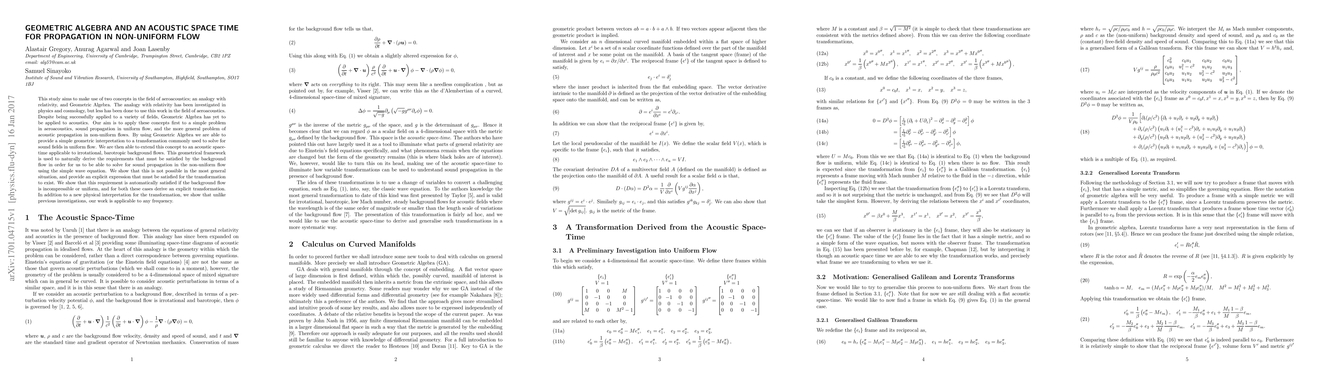 This study aims to make use of two concepts in the field of aeroacoustics; an analogy with relativity, and Geometric Algebra. The analogy with relativity has been investigated in physics and cosmology, but less has been done to use this work in the field of aeroacoustics. Despite being successfully applied to a variety of fields, Geometric Algebra has yet to be applied to acoustics. Our aim is to apply these concepts first to a simple problem in aeroacoustics, sound propagation in uniform flow, and the more general problem of acoustic propagation in non-uniform flows. By using Geometric Algebra we are able to provide a simple geometric interpretation to a transformation commonly used to solve for sound fields in uniform flow. We are then able to extend this concept to an acoustic space-time applicable to irrotational, barotropic background flows. This geometrical framework is used to naturally derive the requirements that must be satisfied by the background flow in order for us to be able to solve for sound propagation in the non-uniform flow using the simple wave equation. We show that this is not possible in the most general situation, and provide an explicit expression that must be satisfied for the transformation to exist. We show that this requirement is automatically satisfied if the background flow is incompressible or uniform, and for both these cases derive an explicit transformation. In addition to a new physical interpretation for the transformation, we show that unlike previous investigations, our work is applicable to any frequency.