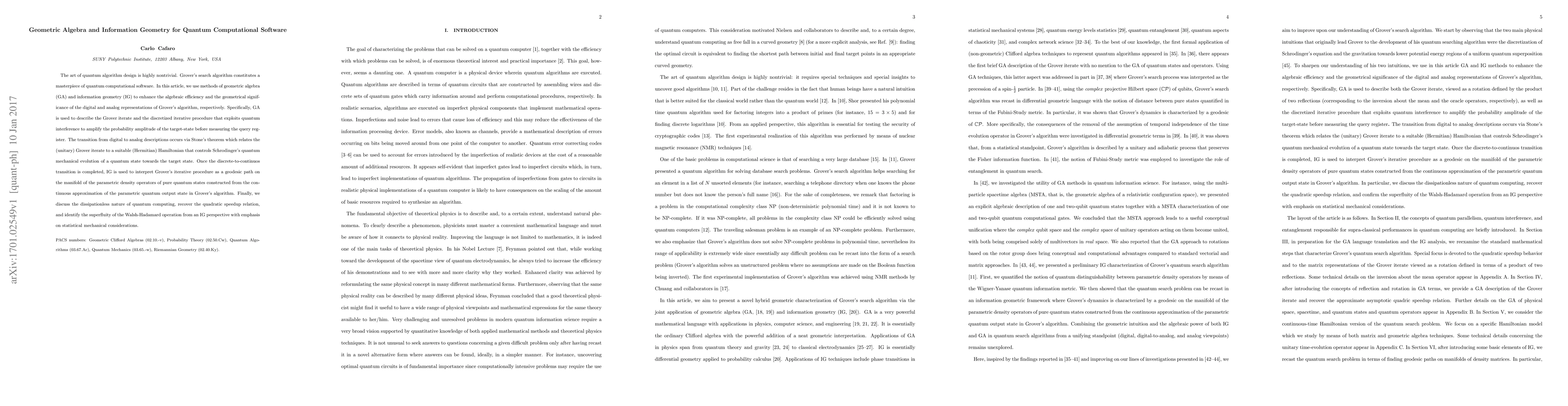 The art of quantum algorithm design is highly nontrivial. Grover's search algorithm constitutes a masterpiece of quantum computational software. In this article, we use methods of geometric algebra (GA) and information geometry (IG) to enhance the algebraic efficiency and the geometrical significance of the digital and analog representations of Grover's algorithm, respectively. Specifically, GA is used to describe the Grover iterate and the discretized iterative procedure that exploits quantum interference to amplify the probability amplitude of the target-state before measuring the query register. The transition from digital to analog descriptions occurs via Stone's theorem which relates the (unitary) Grover iterate to a suitable (Hermitian) Hamiltonian that controls Schrodinger's quantum mechanical evolution of a quantum state towards the target state. Once the discrete-to-continuos transition is completed, IG is used to interpret Grover's iterative procedure as a geodesic path on the manifold of the parametric density operators of pure quantum states constructed from the continuous approximation of the parametric quantum output state in Grover's algorithm. Finally, we discuss the dissipationless nature of quantum computing, recover the quadratic speedup relation, and identify the superfluity of the Walsh-Hadamard operation from an IG perspective with emphasis on statistical mechanical considerations.