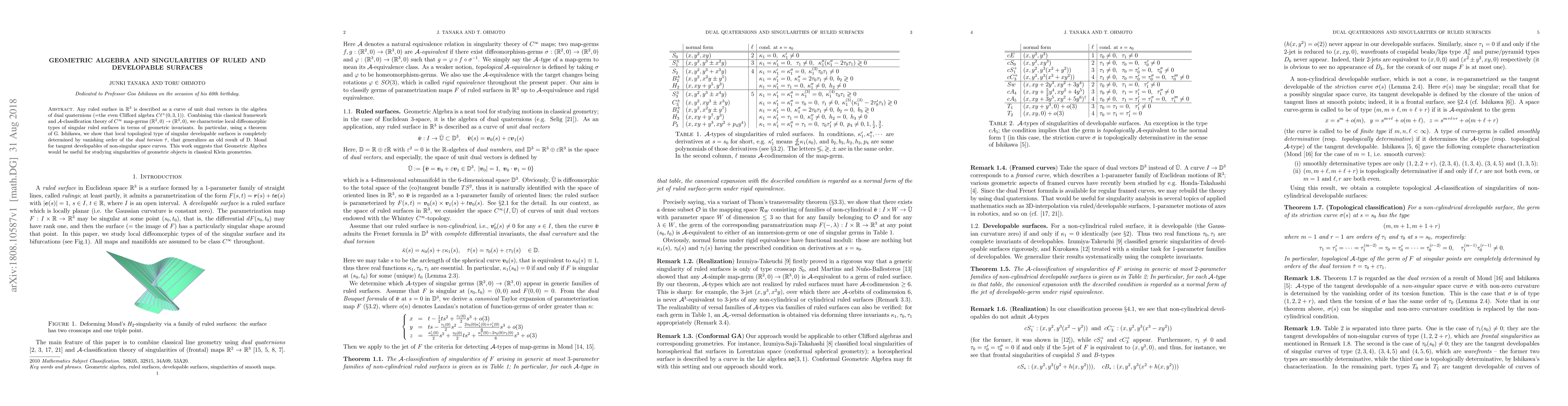 This paper combines geometric algebra and singularity theory to classify singular ruled surfaces in 3-dimensional Euclidean space using dual quaternions. It determines the local topological type of singular developable surfaces based on the vanishing order of dual torsion, extending previous results for tangent developables.