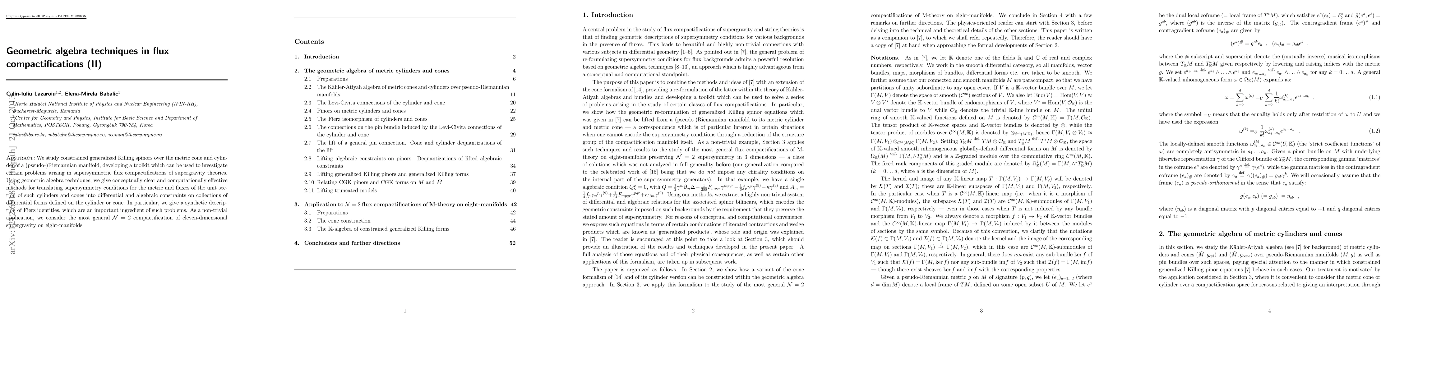 We study constrained generalized Killing spinors over the metric cone and cylinder of a (pseudo-)Riemannian manifold, developing a toolkit which can be used to investigate certain problems arising in supersymmetric flux compactifications of supergravity theories. Using geometric algebra techniques, we give conceptually clear and computationally effective methods for translating supersymmetry conditions for the metric and fluxes of the unit section of such cylinders and cones into differential and algebraic constraints on collections of differential forms defined on the cylinder or cone. In particular, we give a synthetic description of Fierz identities, which are an important ingredient of such problems. As a non-trivial application, we consider the most general N=2 compactification of eleven-dimensional supergravity on eight-manifolds.