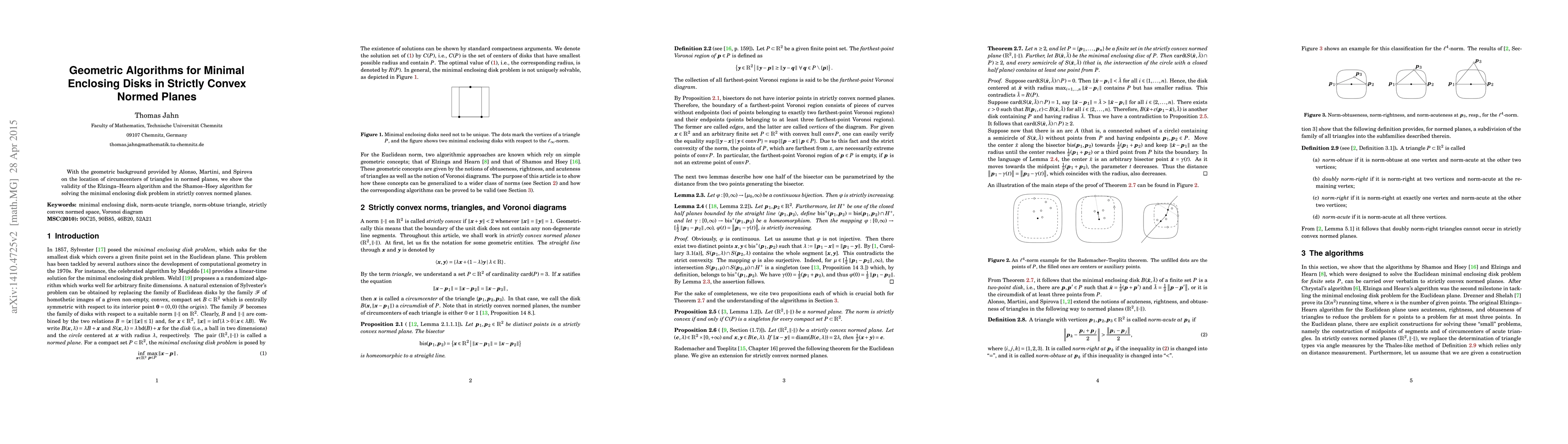 Researchers validate two geometric algorithms for finding minimal enclosing disks in strictly convex normed planes, building on previous work on circumcenters of triangles.