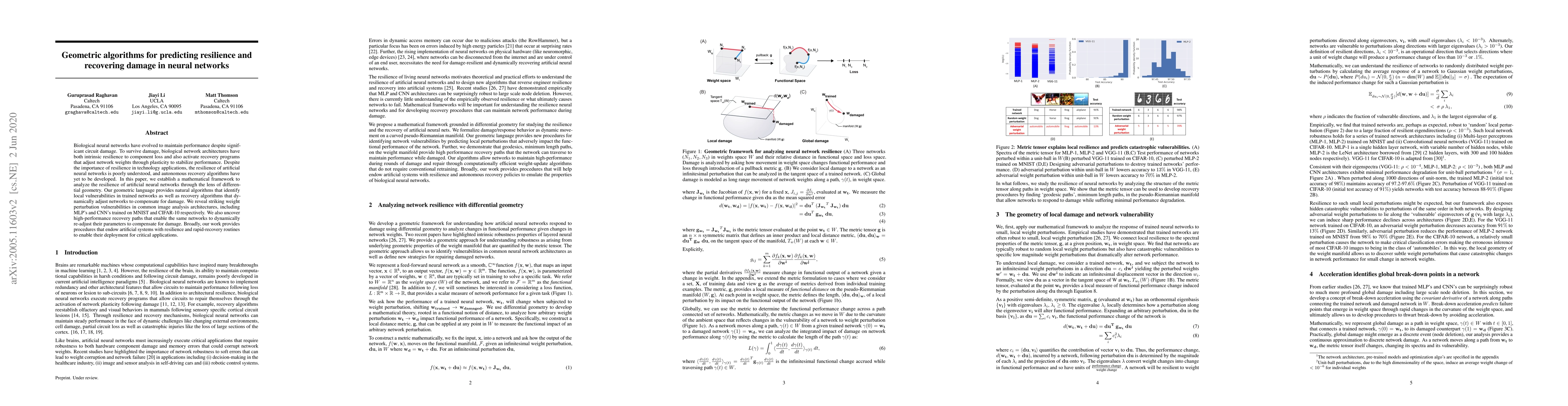 Biological neural networks have evolved to maintain performance despite significant circuit damage. To survive damage, biological network architectures have both intrinsic resilience to component loss and also activate recovery programs that adjust network weights through plasticity to stabilize performance. Despite the importance of resilience in technology applications, the resilience of artificial neural networks is poorly understood, and autonomous recovery algorithms have yet to be developed. In this paper, we establish a mathematical framework to analyze the resilience of artificial neural networks through the lens of differential geometry. Our geometric language provides natural algorithms that identify local vulnerabilities in trained networks as well as recovery algorithms that dynamically adjust networks to compensate for damage. We reveal striking vulnerabilities in commonly used image analysis networks, like MLP's and CNN's trained on MNIST and CIFAR10 respectively. We also uncover high-performance recovery paths that enable the same networks to dynamically re-adjust their parameters to compensate for damage. Broadly, our work provides procedures that endow artificial systems with resilience and rapid-recovery routines to enhance their integration with IoT devices as well as enable their deployment for critical applications.