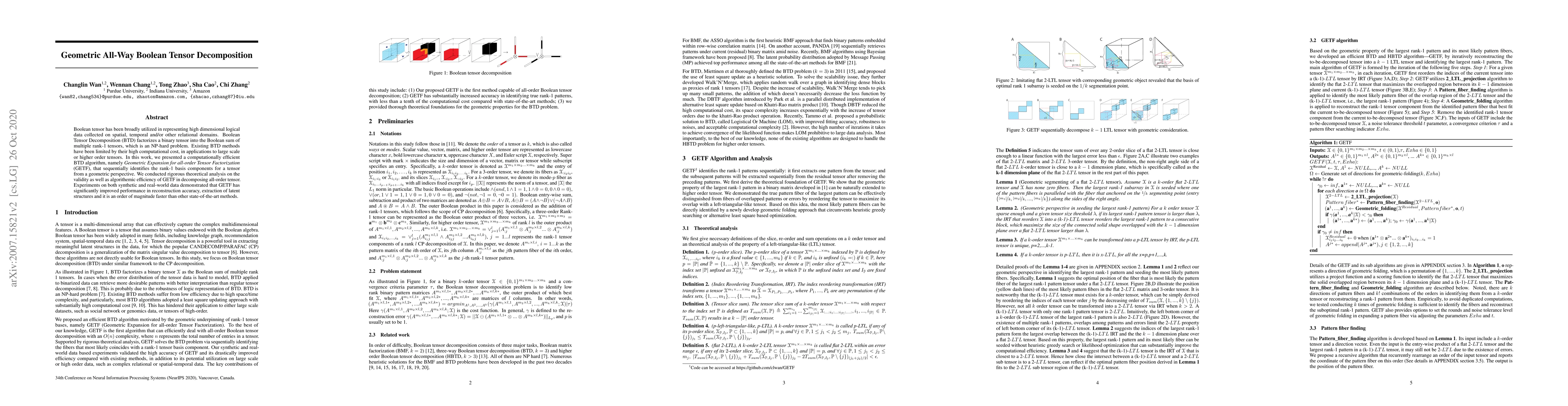 This paper introduces a new computationally efficient Boolean Tensor Decomposition (BTD) algorithm, GETF, which identifies rank-1 components from a geometric perspective. Experiments show that GETF outperforms existing methods in terms of both reconstruction accuracy and computational speed, making it suitable for large-scale tensor applications.