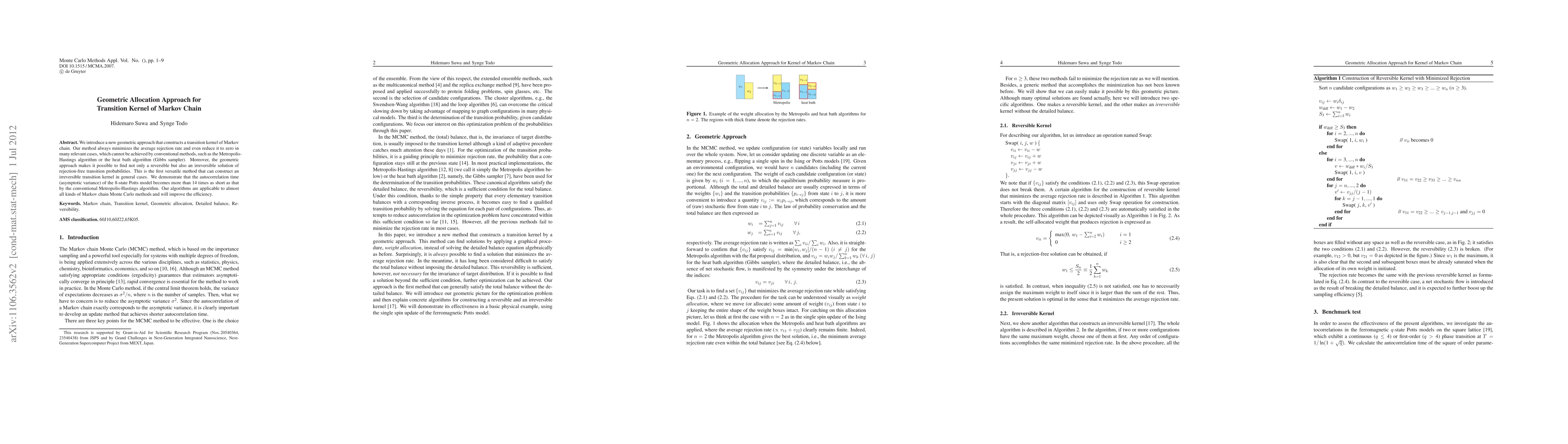 We introduce a new geometric approach that constructs a transition kernel of Markov chain. Our method always minimizes the average rejection rate and even reduce it to zero in many relevant cases, which cannot be achieved by conventional methods, such as the Metropolis-Hastings algorithm or the heat bath algorithm (Gibbs sampler). Moreover, the geometric approach makes it possible to find not only a reversible but also an irreversible solution of rejection-free transition probabilities. This is the first versatile method that can construct an irreversible transition kernel in general cases. We demonstrate that the autocorrelation time (asymptotic variance) of the Potts model becomes more than 6 times as short as that by the conventional Metropolis-Hastings algorithm. Our algorithms are applicable to almost all kinds of Markov chain Monte Carlo methods and will improve the efficiency.