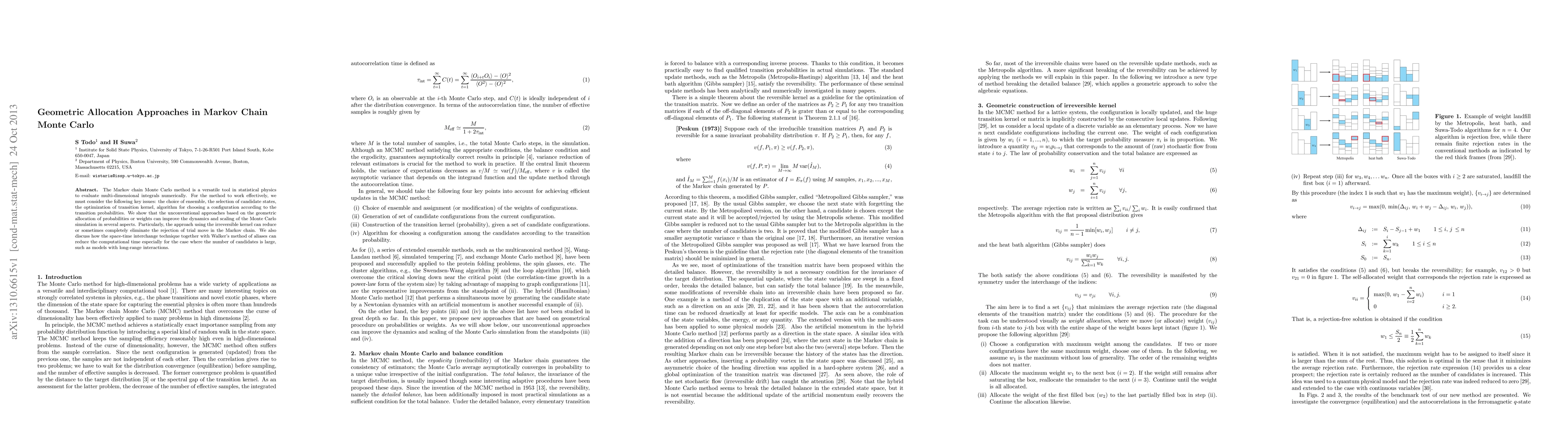 The Markov chain Monte Carlo method is a versatile tool in statistical physics to evaluate multi-dimensional integrals numerically. For the method to work effectively, we must consider the following key issues: the choice of ensemble, the selection of candidate states, the optimization of transition kernel, algorithm for choosing a configuration according to the transition probabilities. We show that the unconventional approaches based on the geometric allocation of probabilities or weights can improve the dynamics and scaling of the Monte Carlo simulation in several aspects. Particularly, the approach using the irreversible kernel can reduce or sometimes completely eliminate the rejection of trial move in the Markov chain. We also discuss how the space-time interchange technique together with Walker's method of aliases can reduce the computational time especially for the case where the number of candidates is large, such as models with long-range interactions.