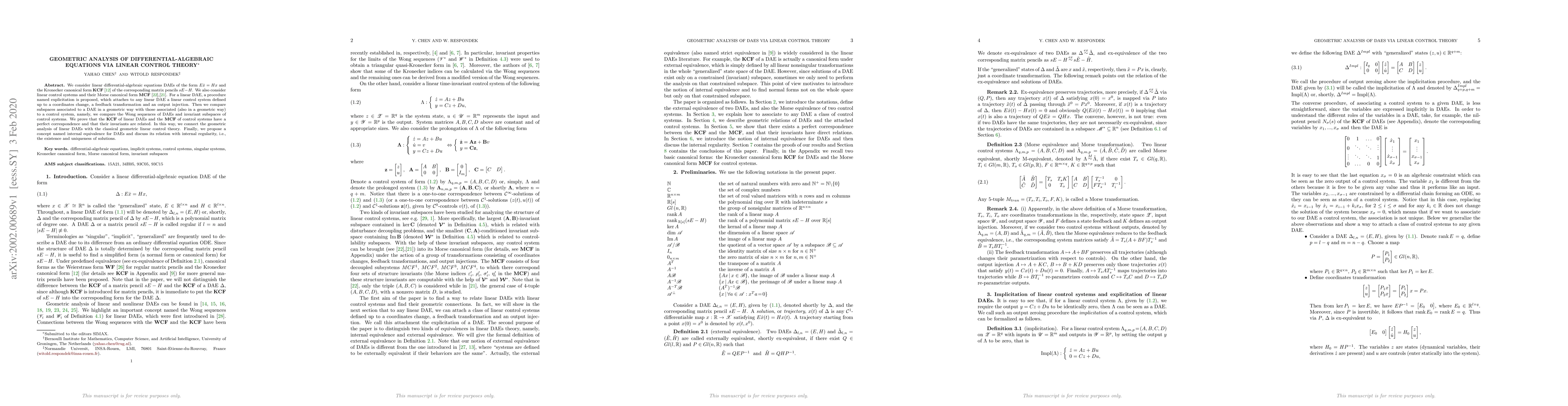 This paper explores the geometric analysis of linear differential-algebraic equations (DAEs) using linear control theory, proposing an explicitation procedure to relate DAEs to control systems. It establishes a correspondence between the Kronecker canonical form of DAEs and the Morse canonical form of control systems, and discusses the concept of internal equivalence in relation to internal regularity and solution uniqueness.