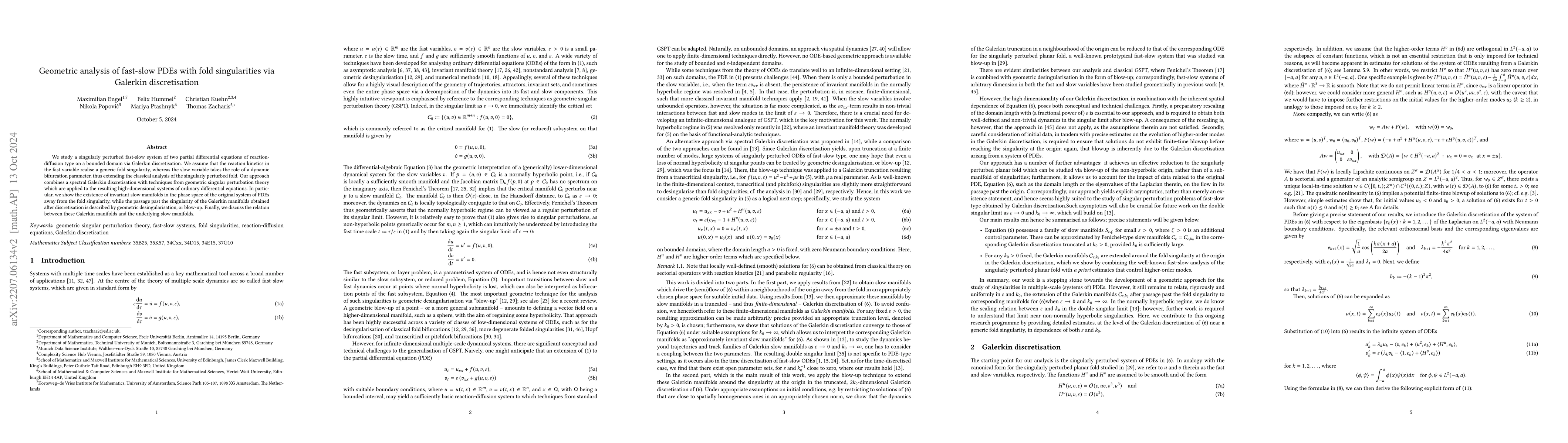 This paper analyzes a singularly perturbed fast-slow system of reaction-diffusion PDEs with fold singularities, employing spectral Galerkin discretization and Geometric Singular Perturbation Theory to demonstrate the existence of invariant manifolds and describe dynamics near the singularity through geometric desingularization.