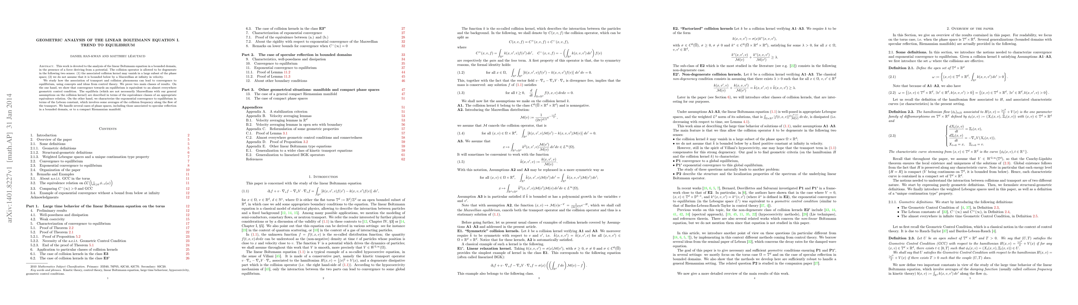 This work is devoted to the analysis of the linear Boltzmann equation in a bounded domain, in the presence of a force deriving from a potential. The collision operator is allowed to be degenerate in the following two senses: (1) the associated collision kernel may vanish in a large subset of the phase space; (2) we do not assume that it is bounded below by a Maxwellian at infinity in velocity. We study how the association of transport and collision phenomena can lead to convergence to equilibrium, using concepts and ideas from control theory. We prove two main classes of results. On the one hand, we show that convergence towards an equilibrium is equivalent to an almost everywhere geometric control condition. The equilibria (which are not necessarily Maxwellians with our general assumptions on the collision kernel) are described in terms of the equivalence classes of an appropriate equivalence relation. On the other hand, we characterize the exponential convergence to equilibrium in terms of the Lebeau constant, which involves some averages of the collision frequency along the flow of the transport. We handle several cases of phase spaces, including those associated to specular reflection in a bounded domain, or to a compact Riemannian manifold.