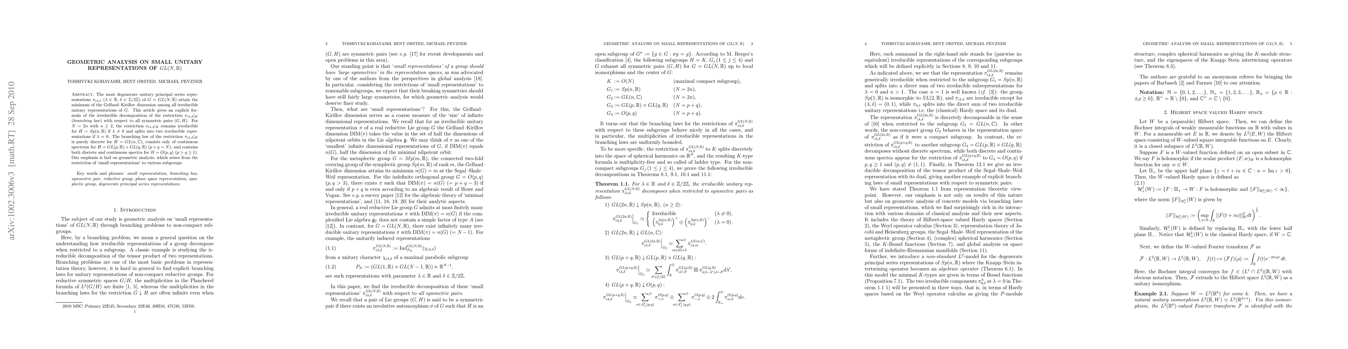 The most degenerate unitary principal series representations {\pi}_{i{\lambda},{\delta}} (with {\lambda} \in R, \delta \in Z/2Z) of G = GL(N,R) attain the minimum of the Gelfand-Kirillov dimension among all irreducible unitary representations of G. This article gives an explicit formula of the irreducible decomposition of the restriction {\pi}_{i{\lambda},{\delta}}|_H (branching law) with respect to all symmetric pairs (G,H). For N=2n with n \geq 2, the restriction {\pi}_{i{\lambda},{\delta}}|_H remains irreducible for H=Sp(n,R) if {\lambda}\neq0 and splits into two irreducible representations if {\lambda}=0. The branching law of the restriction {\pi}_{i{\lambda},{\delta}}|_H is purely discrete for H = GL(n,C), consists only of continuous spectrum for H = GL(p,R) \times GL(q,R) (p+q=N), and contains both discrete and continuous spectra for H=O(p,q) (p>q\geq1). Our emphasis is laid on geometric analysis, which arises from the restriction of `small representations' to various subgroups.