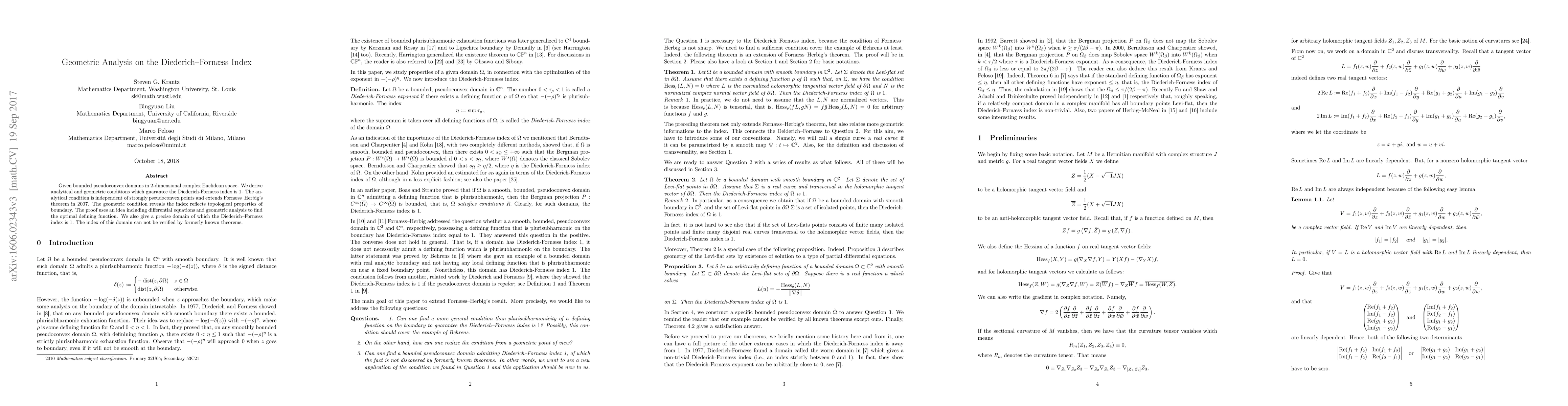 We derive a sufficient condition on a bounded pseudoconvex domain $\Omega\subset\mathbb{C}^2$ with smooth boundary such that $-(-\rho)^\eta$ is plurisubharmonic on $\Omega$ for $\eta>0$ arbitrarily close to $1$ (the supremum of $\eta$ is called Diederich-Forn{\ae}ss index, see Definition (df)). This condition (see Theorem prop) extends a theorem of Forn{\ae}ss and Herbig in 2007 and only requires restriction on Levi-flat sets of the boundary $\partial\Omega$. Since the condition is on Levi-flat sets, it contains more geometric information. As an application of this new condition, we discuss how the geometry of the Levi-flat sets affects the Diederich-Forn{\ae}ss index. Among other results, we show that the Diederich-Forn{\ae}ss index is $1$ if only the Levi-flat sets form a real curve transversal to the holomorphic tangent vector fields on $\partial\Omega$ (see Theorem [main]). We also give a specific example (see Theorem [example]) on the bounded pseudoconvex domains which verify the application but are neither of finite type nor admit a plurisubharmonic defining function on the boundary.