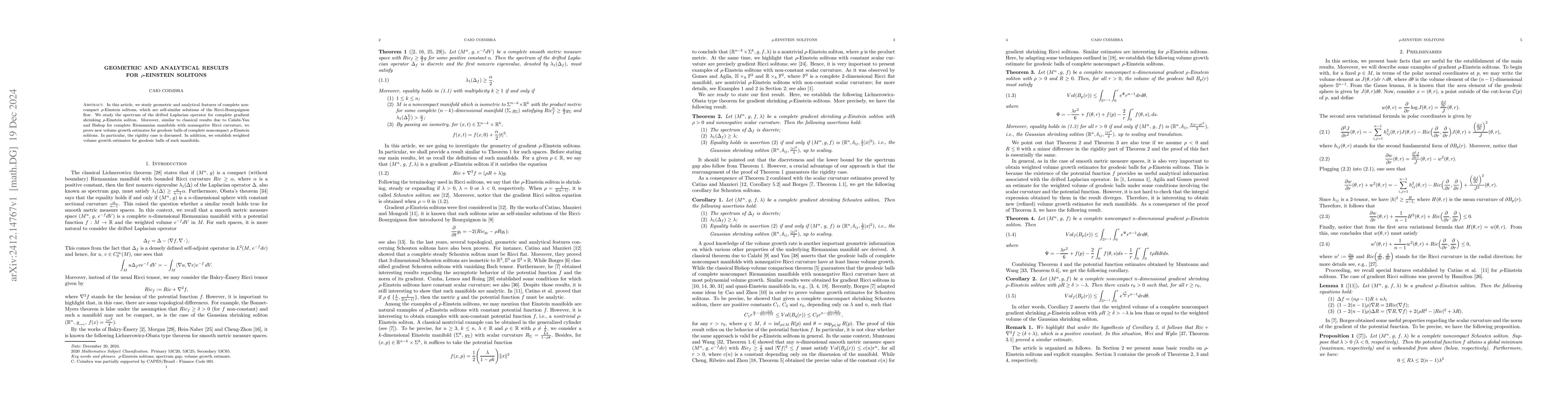 In this article, we study geometric and analytical features of complete noncompact $\rho$-Einstein solitons, which are self-similar solutions of the Ricci-Bourguignon flow. We study the spectrum of the drifted Laplacian operator for complete gradient shrinking $\rho$-Einstein soliton. Moreover, similar to classical results due to Calabi-Yau and Bishop for complete Riemannian manifolds with nonnegative Ricci curvature, we prove new volume growth estimates for geodesic balls of complete noncompact $\rho$-Einstein solitons. In particular, the rigidity case is discussed. In addition, we establish weighted volume growth estimates for geodesic balls of such manifolds.