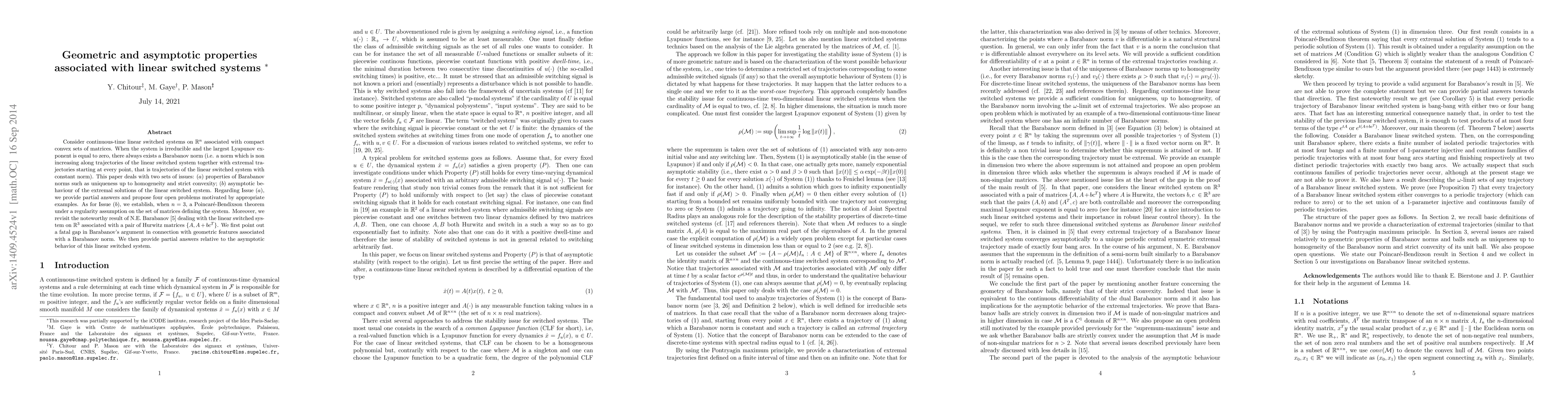 This paper explores geometric and asymptotic properties of linear switched systems on R^n, focusing on the existence of Barabanov norms under specific conditions and the uniqueness and convexity of these norms. It also investigates the asymptotic behavior of extremal solutions, establishing a Poincaré-Bendixson theorem for n=3 and addressing a gap in a previous result by N.E. Barabanov.