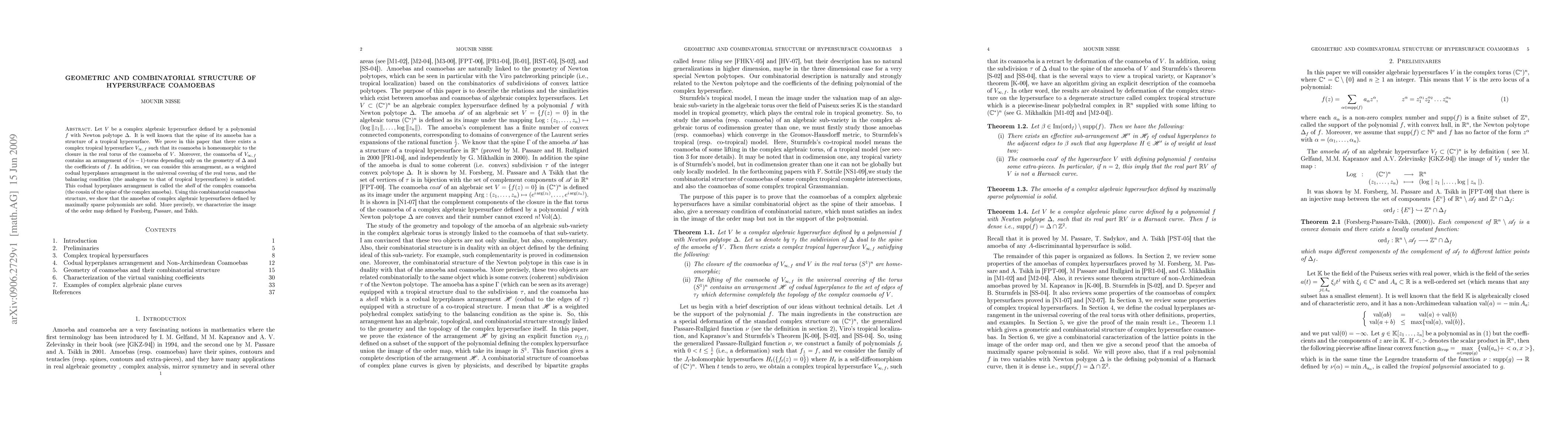 This paper establishes a complex tropical hypersurface whose coamoeba is homeomorphic to the closure of the coamoeba of a given complex algebraic hypersurface in the real torus, revealing an arrangement of $(n-1)$-tori linked to the hypersurface's geometry. It characterizes the amoebas of maximally sparse polynomials as solid, using the new combinatorial structure of coamoebas.