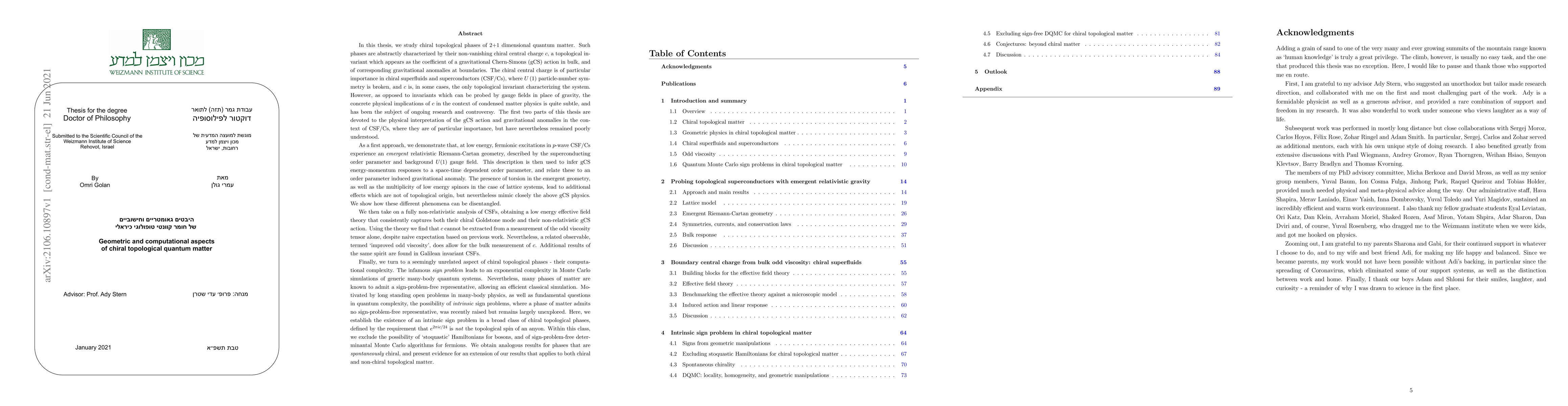 In this thesis, we study chiral topological phases of 2+1 dimensional quantum matter. Such phases are abstractly characterized by their non-vanishing chiral central charge $c$, a topological invariant which appears as the coefficient of a gravitational Chern-Simons (gCS) action in bulk, and of corresponding gravitational anomalies at boundaries. The chiral central charge is of particular importance in chiral superfluids and superconductors (CSF/Cs), where $U(1)$ particle-number symmetry is broken, and $c$ is, in some cases, the only topological invariant characterizing the system. However, as opposed to invariants which can be probed by gauge fields in place of gravity, the concrete physical implications of $c$ in the context of condensed matter physics is quite subtle, and has been the subject of ongoing research and controversy. The first two parts of this thesis are devoted to the physical interpretation of the gCS action and gravitational anomalies in the context of CSF/Cs, where they are of particular importance, but have nevertheless remained poorly understood. We then turn to a seemingly unrelated aspect of chiral topological phases - their computational complexity. The infamous $sign\ problem$ leads to an exponential complexity in Monte Carlo simulations of generic many-body quantum systems. Nevertheless, many phases of matter are known to admit a sign-problem-free representative, allowing an efficient classical simulation. The possibility of $intrinsic$ sign problems, where a phase of matter admits no sign-problem-free representative, was recently raised but remains largely unexplored. Here, we establish the existence of an intrinsic sign problem in a broad class of chiral topological phases, both bosonic and fermionic, defined by the requirement that $e^{2\pi i c/24}$ is $not$ the topological spin of an anyon.
