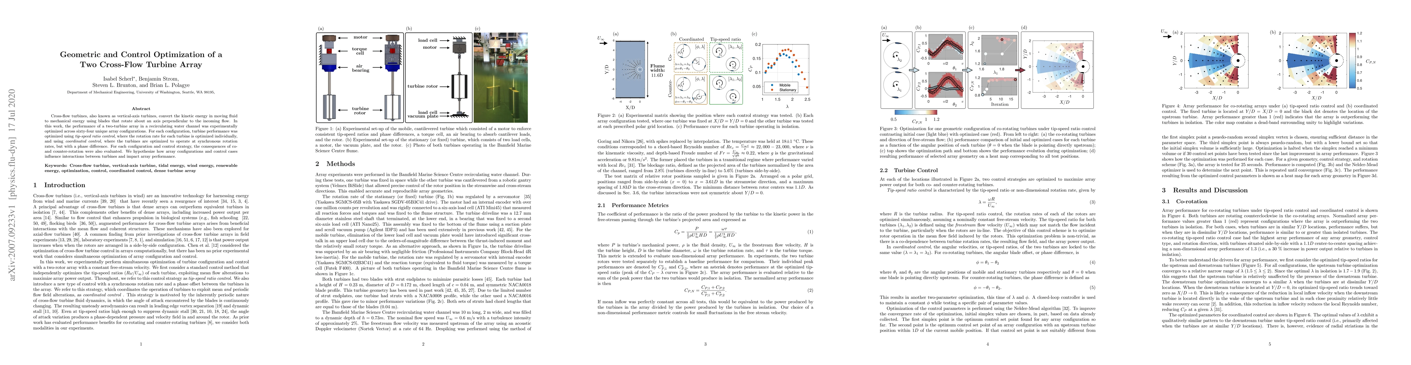 This study experimentally optimizes the performance of a two-cross-flow turbine array in a recirculating water channel across sixty-four configurations, employing both individual tip-speed ratio control and coordinated control strategies to evaluate the effects of co- and counter-rotation on turbine interactions and overall array efficiency.