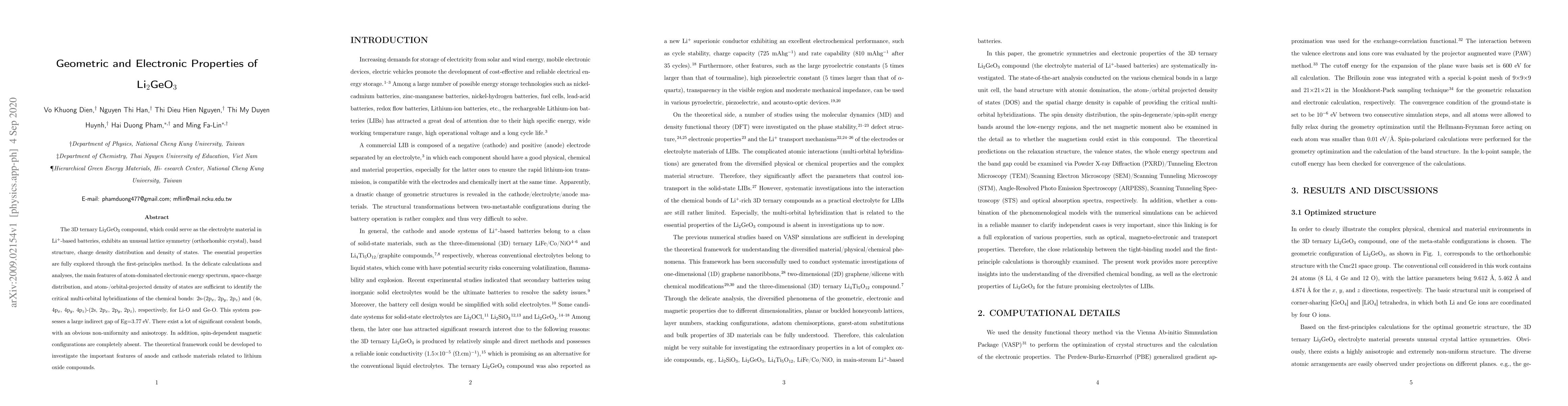The 3D ternary Li$_2$GeO$_3$ compound, which could serve as the electrolyte material in Li+-based batteries, exhibits an unusual lattice symmetry (orthorhombic crystal), band structure, charge density distribution and density of states. The essential properties are fully explored through the first-principles method. In the delicate calculations and analyses, the main features of atom-dominated electronic energy spectrum, space-charge distribution, and atom-/orbital-projected density of states are suffi$cient to identify the critical multi-orbital hybridizations of the chemical bonds: 2s-(2p$_x, 2p$_y$, 2p$_z$) and (4s, 4p$_x$, 4p$_y$, 4p$_z$)-(2s, 2p$_x$, 2p$_y$, 2p$_z$), respectively, for Li-O and Ge-O. This system possesses a large indirect gap of Eg = 3.77 eV. There exist a lot of significant covalent bonds, with an obvious non-uniformity and anisotropy. In addition, spin-dependent magnetic configurations are completely absent. The theoretical framework could be developed to investigate the important features of anode and cathode materials related to lithium oxide compounds.