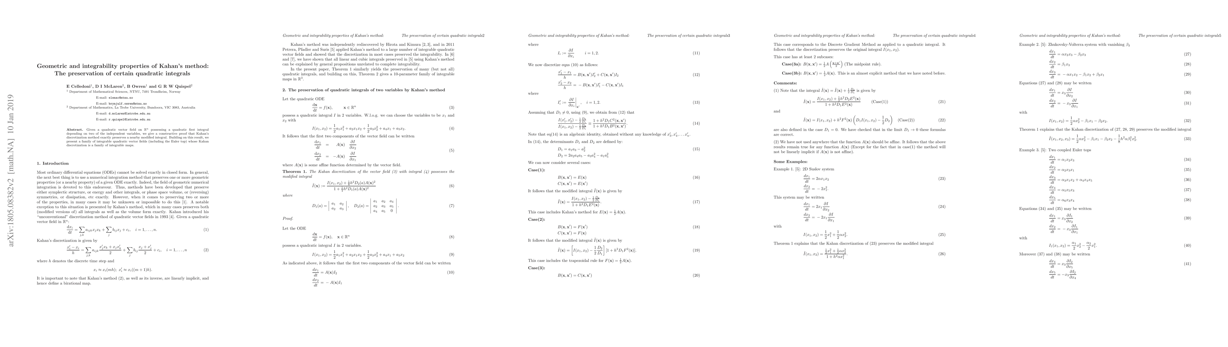 Given a quadratic vector field on \mathbb{R}^n possessing a quadratic first integral depending on two of the independent variables, we give a constructive proof that Kahan's discretization method exactly preserves a nearby modifed integral. Building on this result, we present a family of integrable quadratic vector fields (including the Euler top) whose Kahan discretization is a novel 10-parameter family of integrable maps.