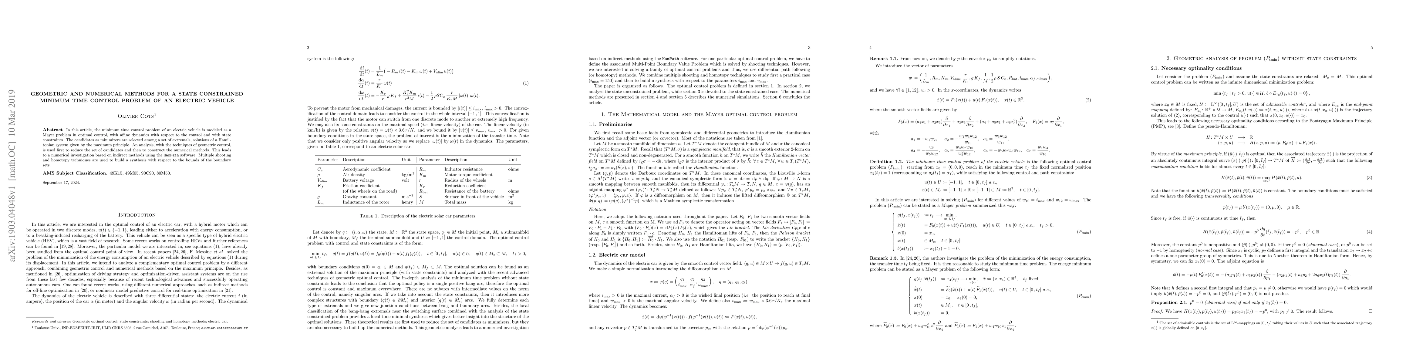 This paper models an electric vehicle's minimum time control problem as a Mayer problem in optimal control, applying geometric and numerical methods to find extremal solutions. It uses geometric control techniques and the maximum principle to construct numerical methods, employing HamPath software, multiple shooting, and homotopy techniques for synthesis.