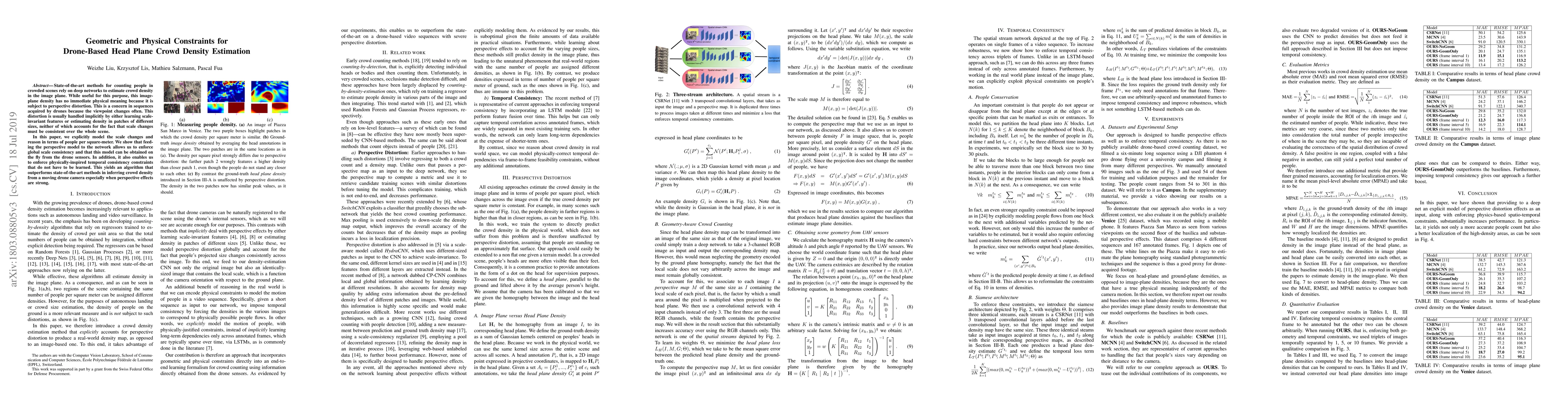 State-of-the-art methods for counting people in crowded scenes rely on deep networks to estimate crowd density in the image plane. While useful for this purpose, this image-plane density has no immediate physical meaning because it is subject to perspective distortion. This is a concern in sequences acquired by drones because the viewpoint changes often. This distortion is usually handled implicitly by either learning scale-invariant features or estimating density in patches of different sizes, neither of which accounts for the fact that scale changes must be consistent over the whole scene. In this paper, we explicitly model the scale changes and reason in terms of people per square-meter. We show that feeding the perspective model to the network allows us to enforce global scale consistency and that this model can be obtained on the fly from the drone sensors. In addition, it also enables us to enforce physically-inspired temporal consistency constraints that do not have to be learned. This yields an algorithm that outperforms state-of-the-art methods in inferring crowd density from a moving drone camera especially when perspective effects are strong.