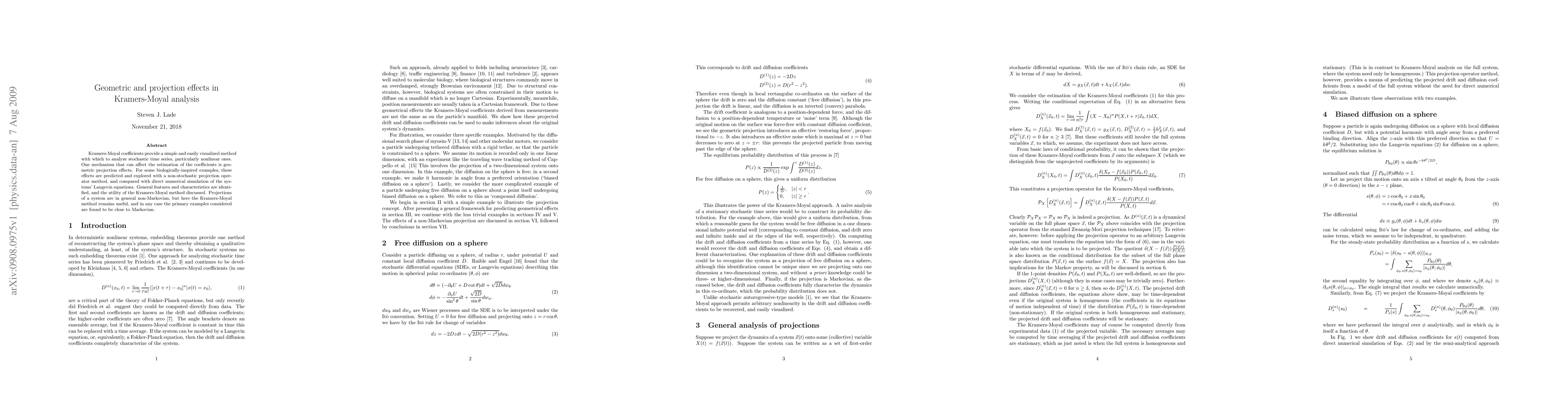Kramers-Moyal coefficients provide a simple and easily visualized method with which to analyze stochastic time series, particularly nonlinear ones. One mechanism that can affect the estimation of the coefficients is geometric projection effects. For some biologically-inspired examples, these effects are predicted and explored with a non-stochastic projection operator method, and compared with direct numerical simulation of the systems' Langevin equations. General features and characteristics are identified, and the utility of the Kramers-Moyal method discussed. Projections of a system are in general non-Markovian, but here the Kramers-Moyal method remains useful, and in any case the primary examples considered are found to be close to Markovian.