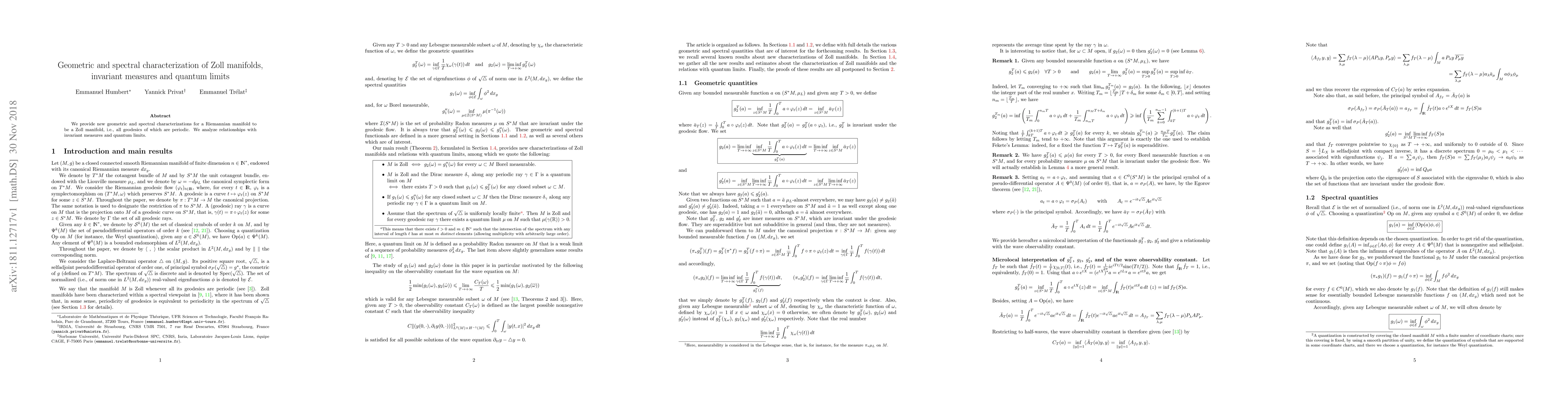 We provide new geometric and spectral characterizations for a Riemannian manifold to be a Zoll manifold, i.e., all geodesics of which are periodic. We analyze relationships with invariant measures and quantum limits.
