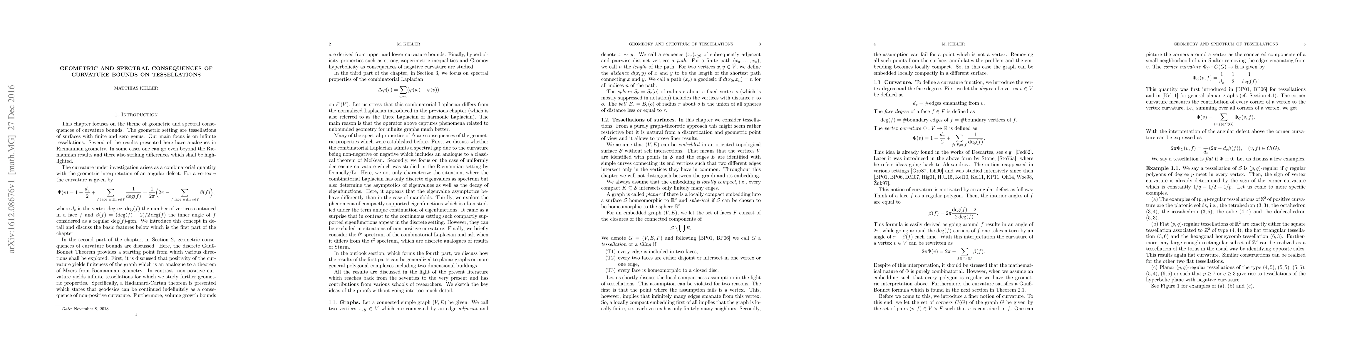This paper surveys geometric and spectral outcomes of curvature bounds within tessellations of surfaces, comparing results to Riemannian geometry and highlighting both extensions and differences.