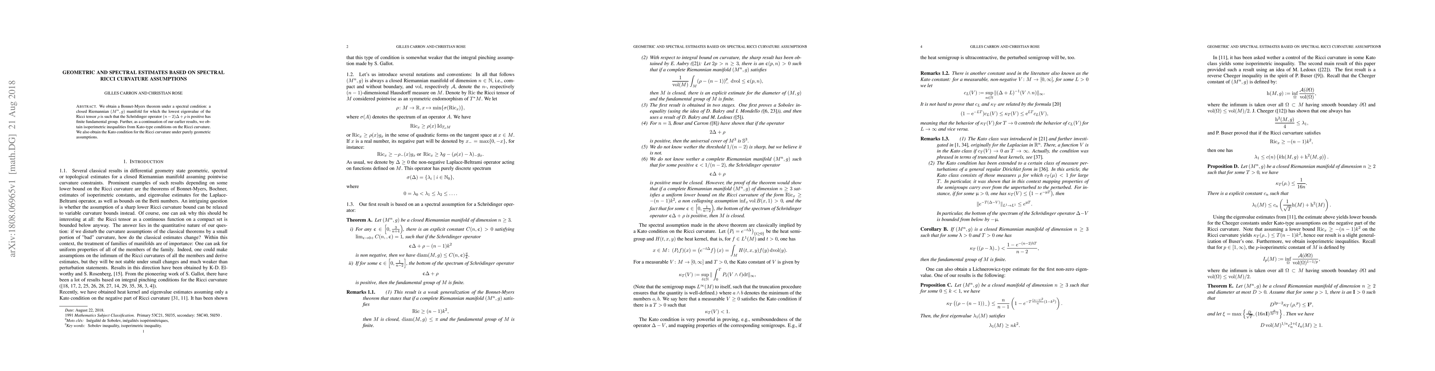 We obtain a Bonnet-Myers theorem under a spectral condition: a closed Riemannian manifold $(M^n,g)$ for which the lowest eigenvalue of the Ricci tensor $\rho$ is such that the Schr\"odinger operator $(n-2)\Delta + \rho$ is positive has finite fundamental group. As a continuation of our earlier results, we obtain isoperimetric inequalities from a Kato condition on the Ricci curvature. Furthermore, we obtain the Kato condition for the Ricci curvature under purely geometric assumptions.