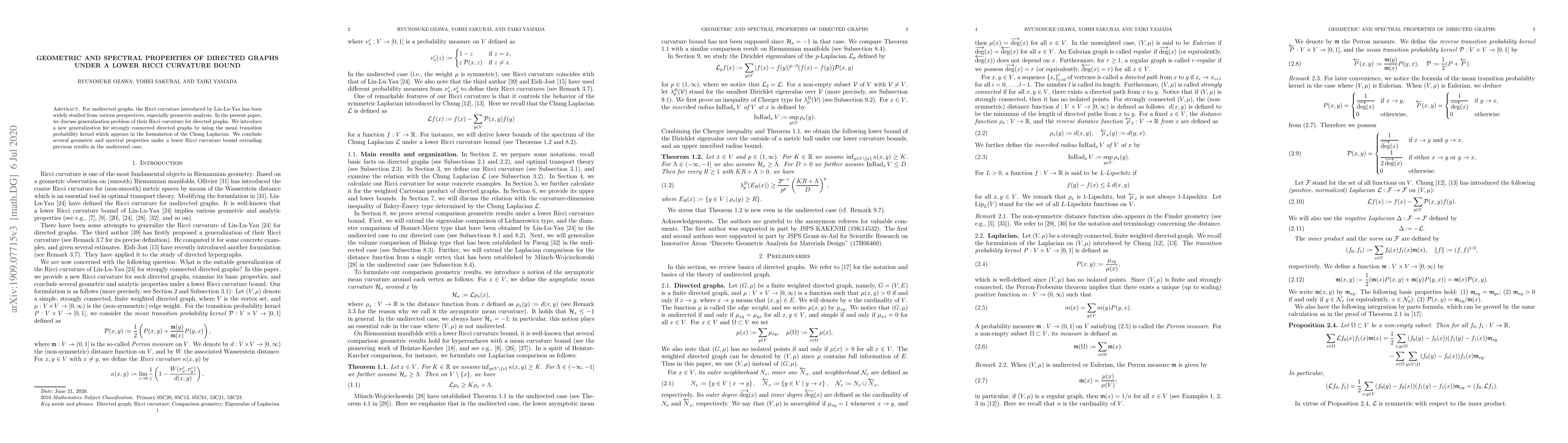 This paper generalizes the Ricci curvature concept for directed graphs using the mean transition probability kernel from the Chung Laplacian. It establishes geometric and spectral properties of directed graphs under a lower Ricci curvature bound, extending previous results from undirected graphs.