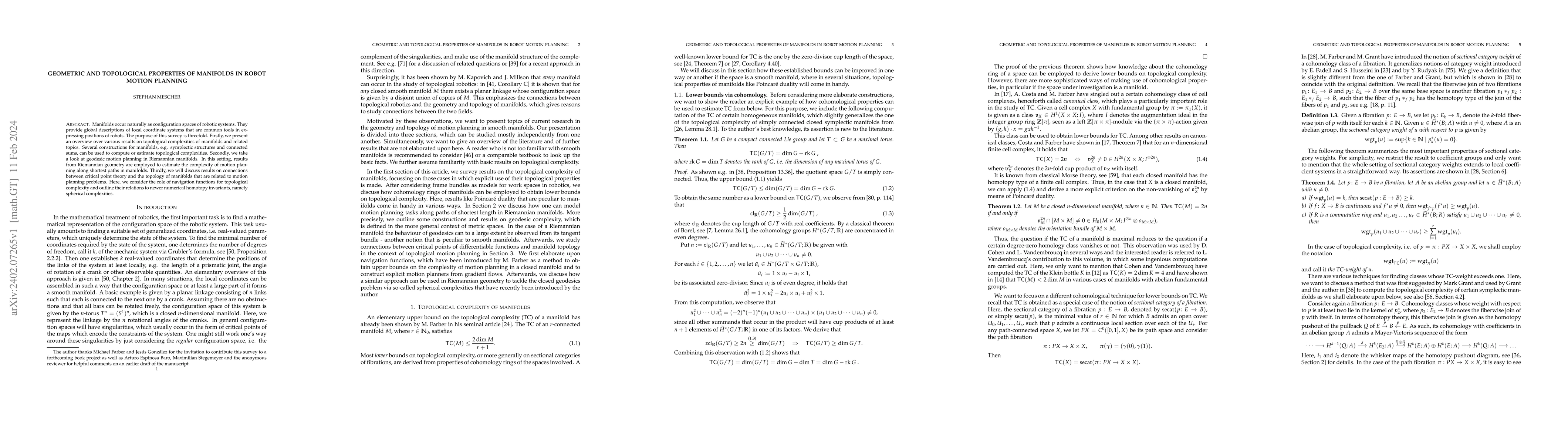 This paper surveys the geometric and topological properties of manifolds used in robot motion planning, focusing on topological complexities, geodesic motion planning in Riemannian manifolds, and the connections between critical point theory and navigation functions. It also explores the use of spherical complexities as newer numerical homotopy invariants.