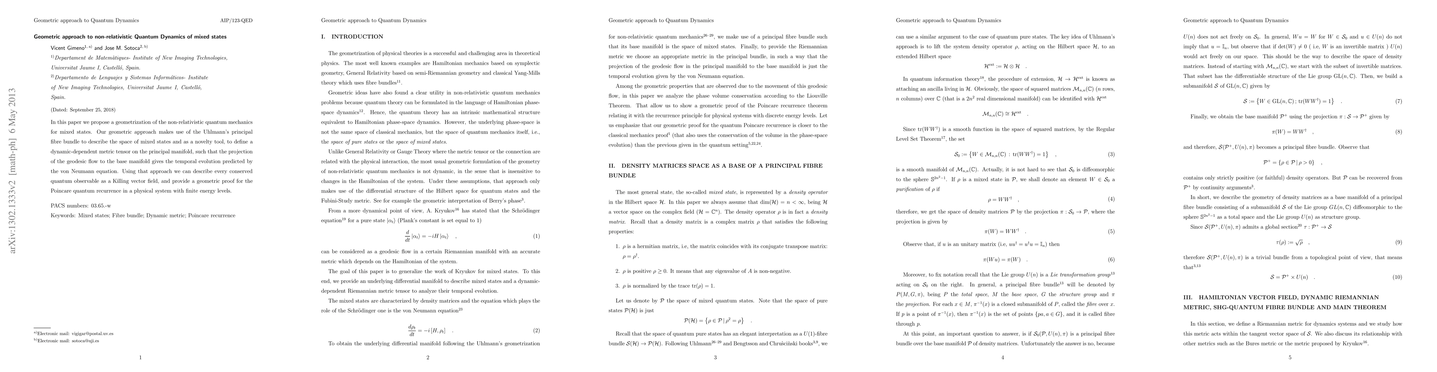 This paper proposes a geometric framework for the non-relativistic quantum dynamics of mixed states using Uhlmann's principal fibre bundle, introducing a dynamic-dependent metric tensor to describe temporal evolution. It also provides a geometric proof for the Poincaré quantum recurrence.