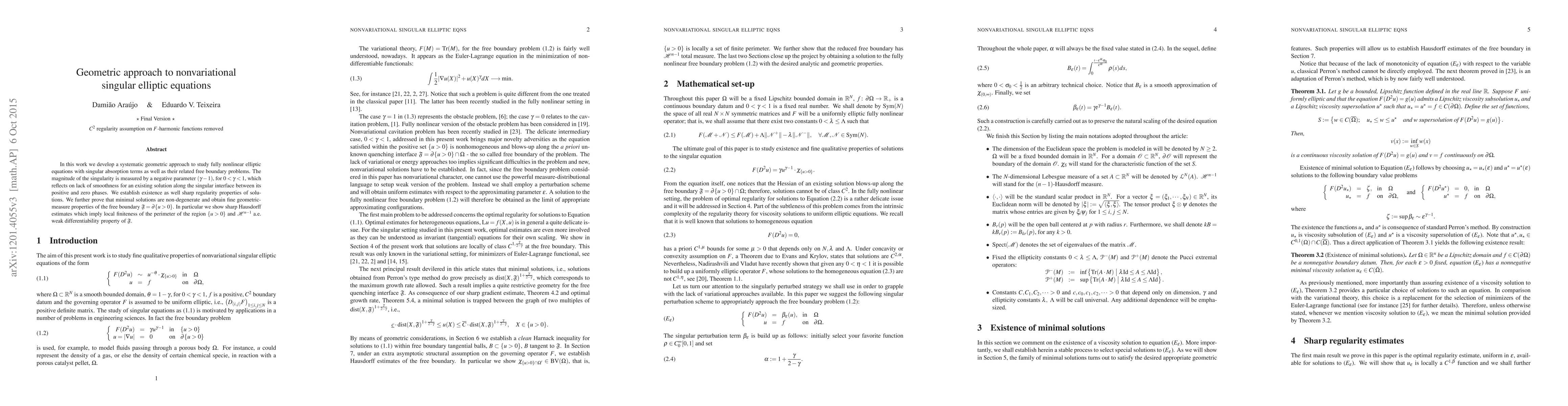 This paper develops a geometric approach to study fully nonlinear singular elliptic equations with absorption terms, proving existence and sharp regularity of solutions. It also establishes fine geometric-measure properties of the free boundary, including Hausdorff estimates and weak differentiability.