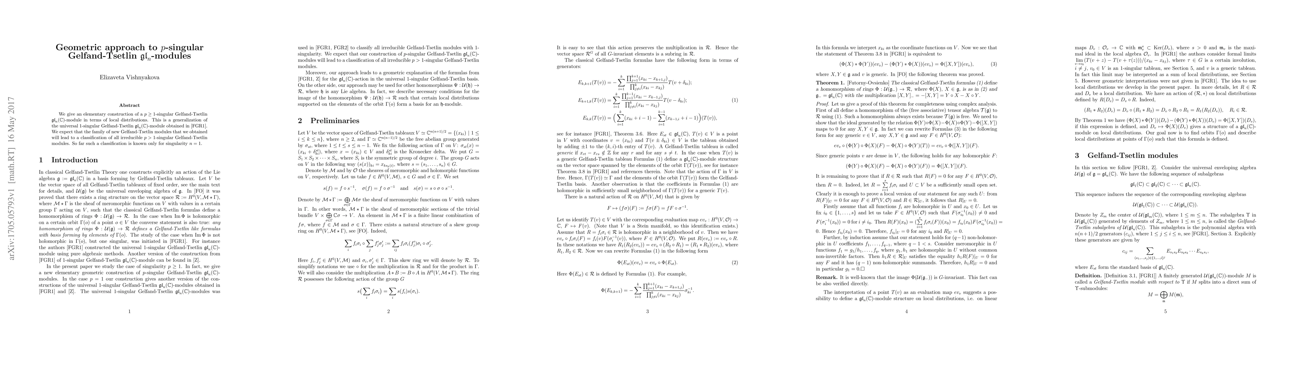 This paper presents an elementary construction of $p$-singular Gelfand-Tsetlin $\mathfrak{gl}_n(\mathbb{C})$-modules using local distributions, extending the previously known universal $1$-singular case. The authors anticipate that these new modules will facilitate the classification of all irreducible $p>1$-singular Gelfand-Tsetlin modules, currently only classified for $p=1$.