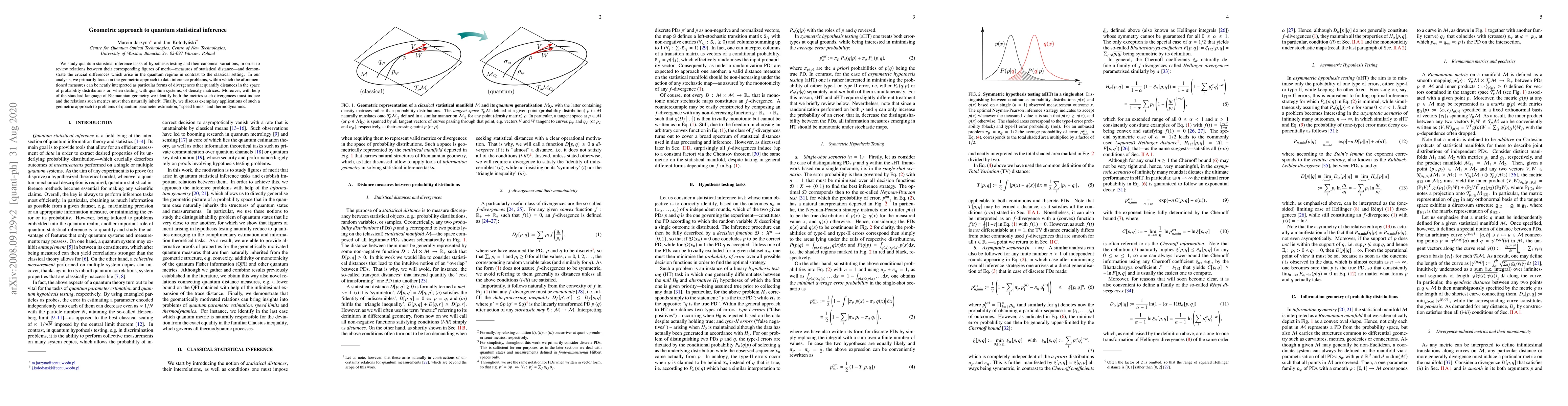 This paper explores quantum statistical inference tasks, focusing on hypothesis testing and its measures of statistical distance. It highlights the geometric approach to data inference, interpreting measures as divergences in the space of probability distributions or density matrices, and discusses the implications for quantum parameter estimation, "speed limits," and thermodynamics.
