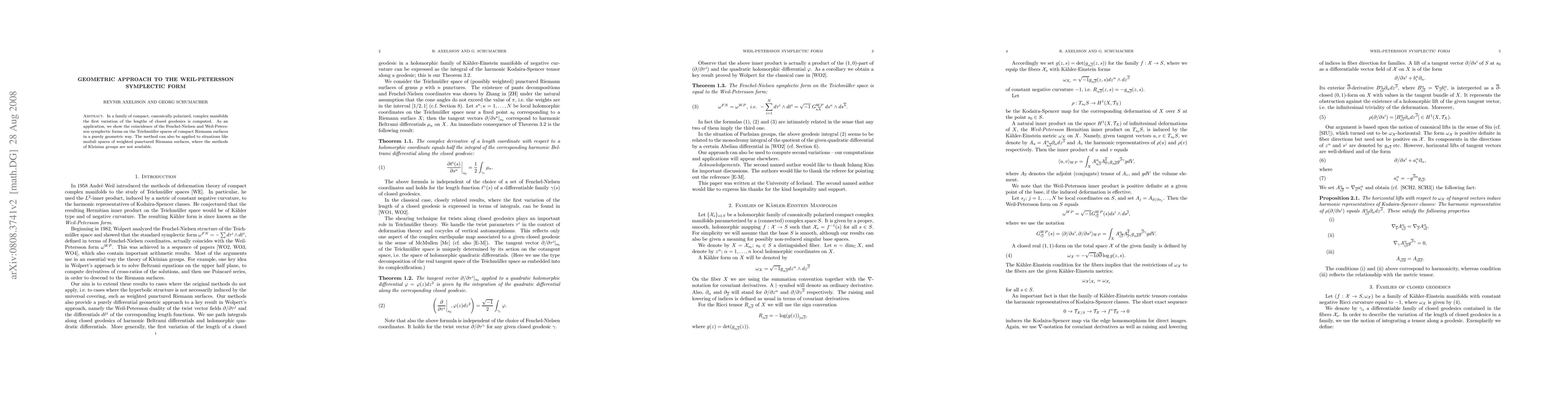 In a family of compact, canonically polarized, complex manifolds the first variation of the lengths of closed geodesics is computed. As an application, we show the coincidence of the Fenchel-Nielsen and Weil-Petersson symplectic forms on the Teichmueller spaces of compact Riemann surfaces in a purely geometric way. The method can also be applied to situations like moduli spaces of weighted punctured Riemann surfaces, where the methods of Kleinian groups are not available.