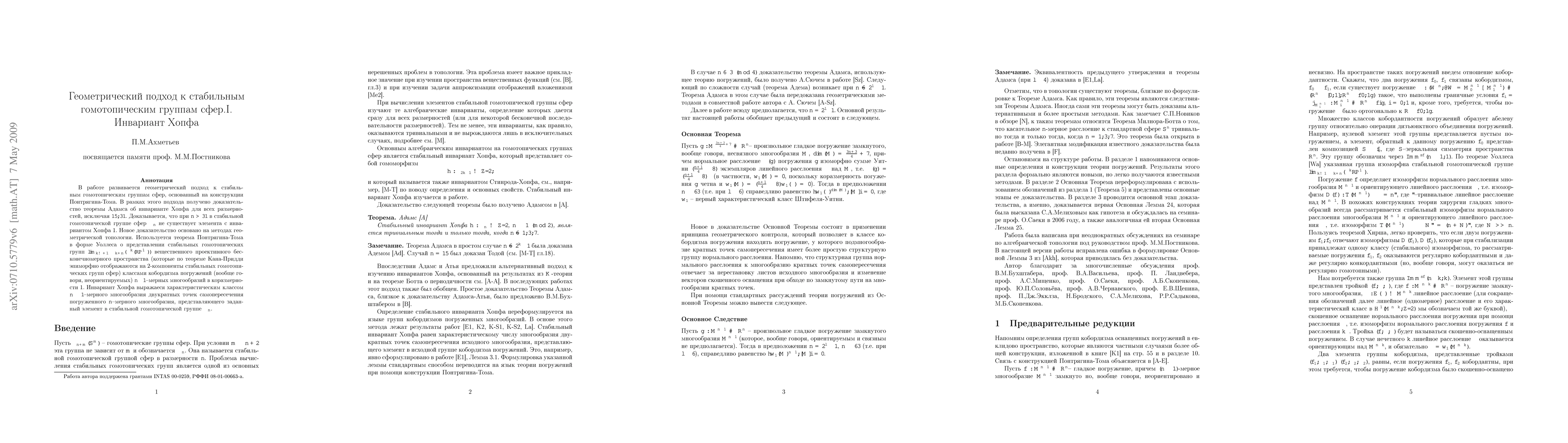 This paper presents a geometric approach to understanding stable homotopy groups of spheres, leveraging Pontrjagin and Rokhlin's methods. A new proof of Adams' Hopf Invariant One Theorem is provided for dimensions excluding 15 and 31, using geometric topology techniques like the Pontrjagin-Thom construction and Hirsch's compression lemma to show that the stable Hopf invariant vanishes for n>31.