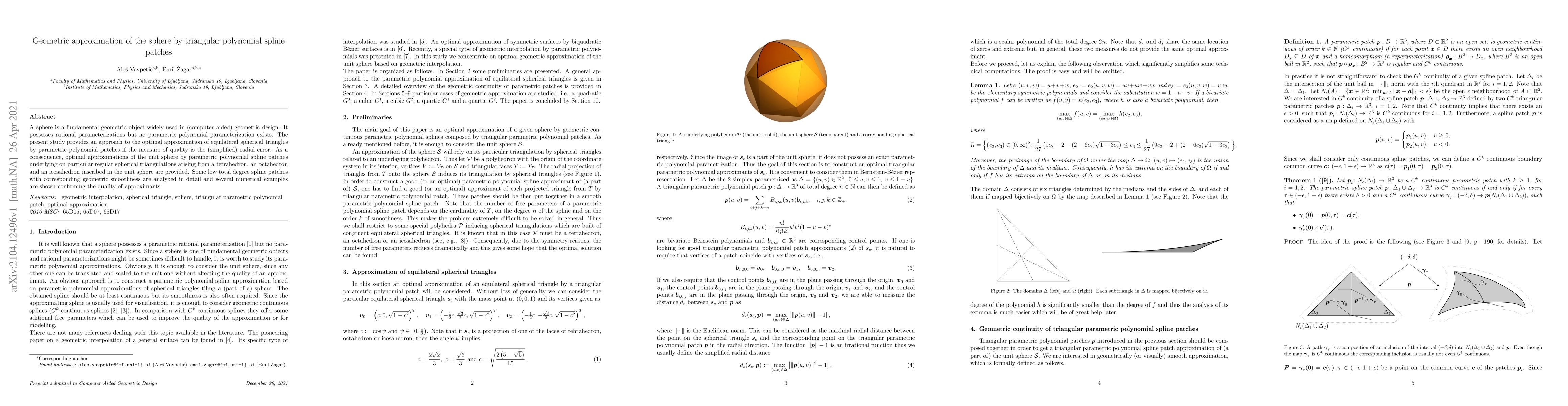 This paper presents a method for approximating a sphere using parametric polynomial spline patches based on equilateral spherical triangles. It provides optimal approximations for the unit sphere derived from regular spherical triangulations of a tetrahedron, octahedron, and icosahedron, demonstrating their geometric smoothness and accuracy through numerical examples.