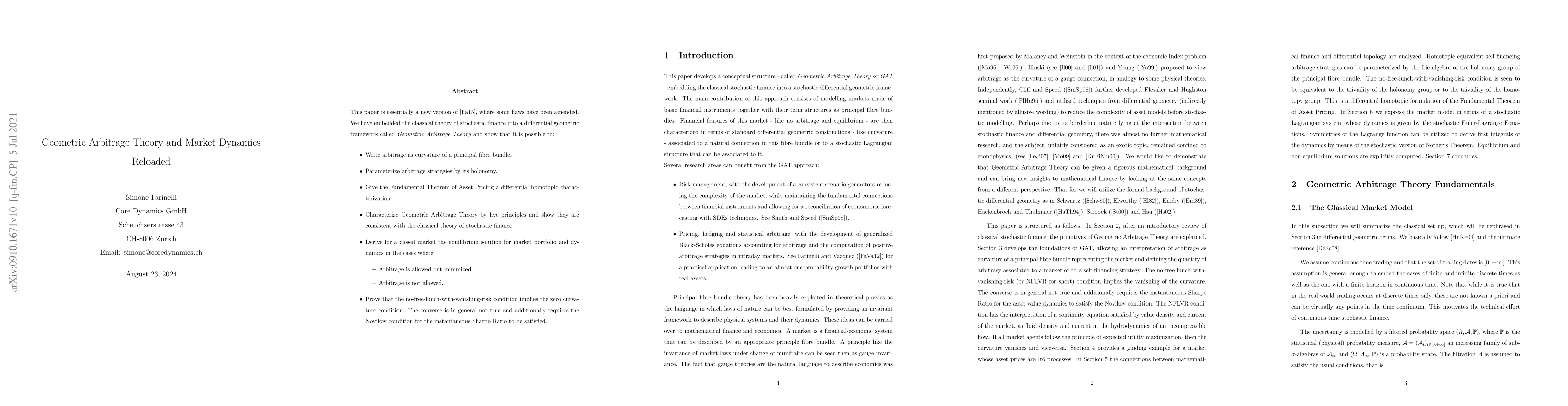 We have embedded the classical theory of stochastic finance into a differential geometric framework called Geometric Arbitrage Theory and show that it is possible to: --Write arbitrage as curvature of a principal fibre bundle. --Parameterize arbitrage strategies by its holonomy. --Give the Fundamental Theorem of Asset Pricing a differential homotopic characterization. --Characterize Geometric Arbitrage Theory by five principles and show they they are consistent with the classical theory of stochastic finance. --Derive for a closed market the equilibrium solution for market portfolio and dynamics in the cases where: -->Arbitrage is allowed but minimized. -->Arbitrage is not allowed. --Prove that the no-free-lunch-with-vanishing-risk condition implies the zero curvature condition.