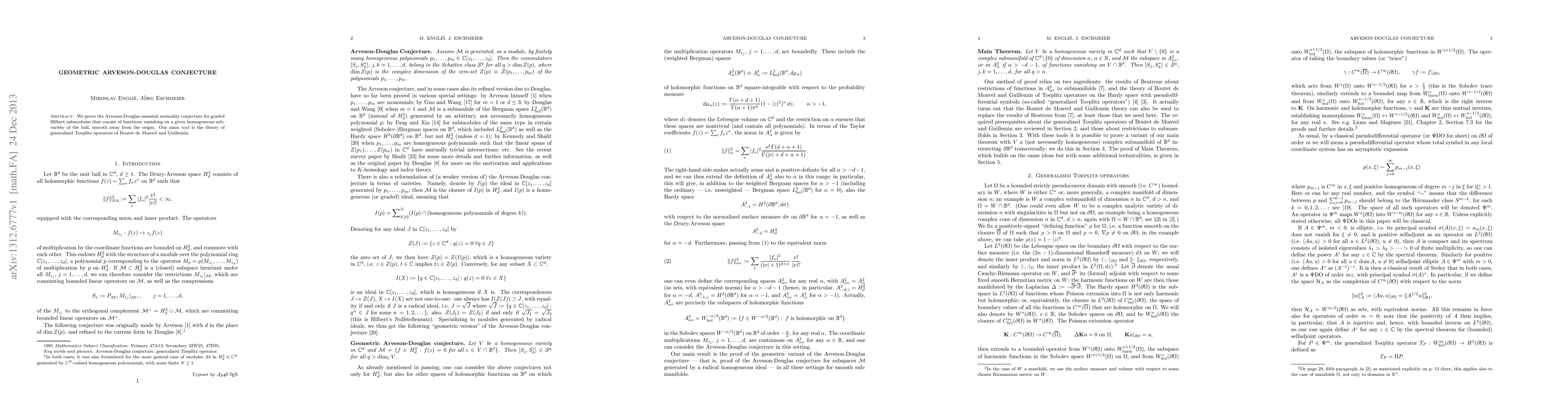 We prove the Arveson-Douglas essential normality conjecture for graded Hilbert submodules that consist of functions vanishing on a given homogeneous subvariety of the ball, smooth away from the origin. Our main tool is the theory of generalized Toeplitz operators of Boutet de Monvel and Guillemin.