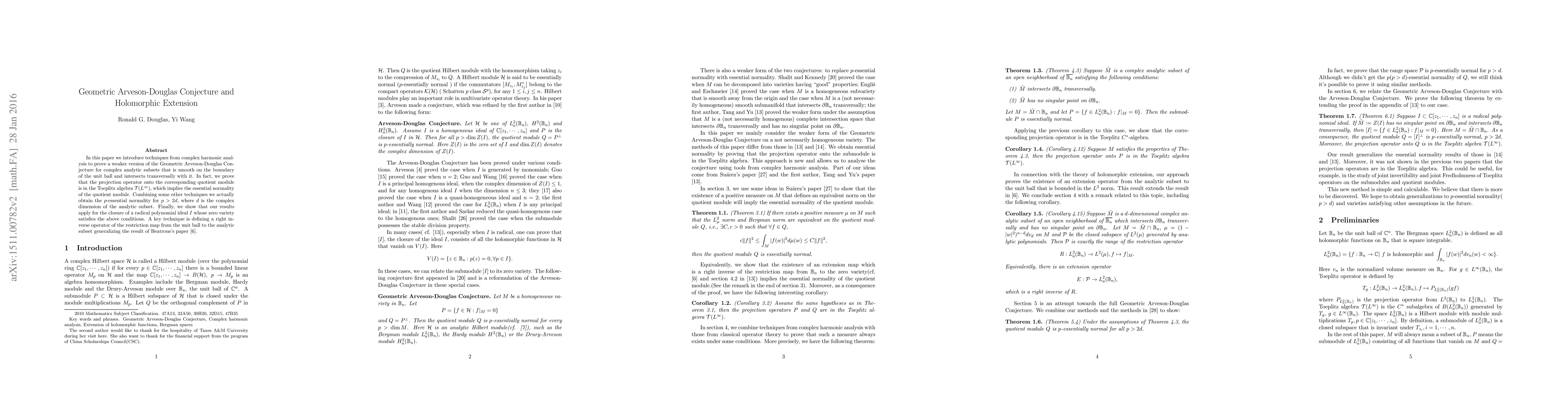 In this paper we introduce techniques from complex harmonic analysis to prove a weaker version of the Geometric Arveson-Douglas Conjecture for complex analytic subsets that is smooth on the boundary of the unit ball and intersects transversally with it. In fact, we prove that the projection operator onto the corresponding quotient module is in the Toeplitz algebra $\mathcal{T}(L^{\infty})$, which implies the essential normality of the quotient module. Combining some other techniques we actually obtain the $p$-essential normality for $p>2d$, where $d$ is the complex dimension of the analytic subset. Finally, we show that our results apply for the closure of a radical polynomial ideal $I$ whose zero variety satisfies the above conditions. A key technique is defining a right inverse operator of the restriction map from the unit ball to the analytic subset generalizing the result of Beatrous's paper "$L^p$-estimates for extensions of holomorphic functions".