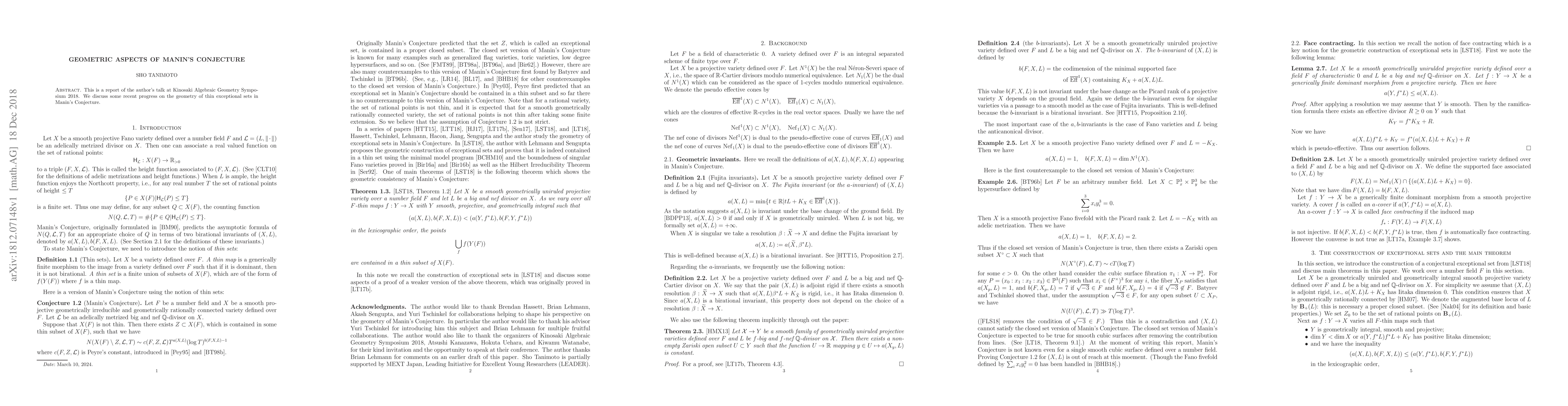 Summary: This paper reports on recent advancements in understanding the geometric aspects of Manin's Conjecture, specifically focusing on the thin exceptional sets, presented at the Kinosaki Algebraic Geometry Symposium 2018. The findings highlight new insights into the geometrical properties relevant to the conjecture.