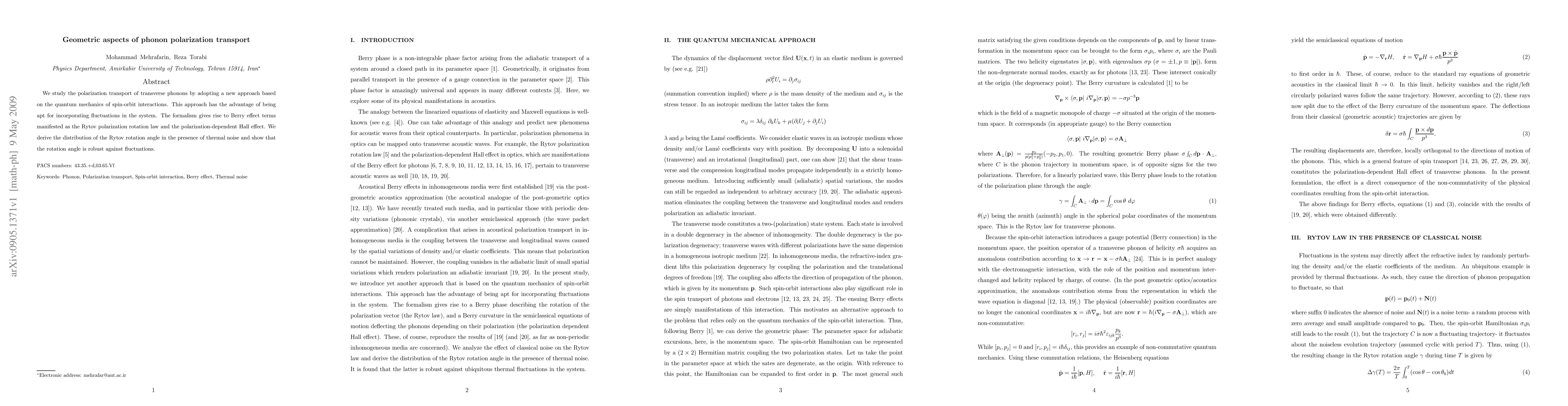 We study the polarization transport of transverse phonons by adopting a new approach based on the quantum mechanics of spin-orbit interactions. This approach has the advantage of being apt for incorporating fluctuations in the system. The formalism gives rise to Berry effect terms manifested as the Rytov polarization rotation law and the polarization-dependent Hall effect. We derive the distribution of the Rytov rotation angle in the presence of thermal noise and show that the rotation angle is robust against fluctuations.