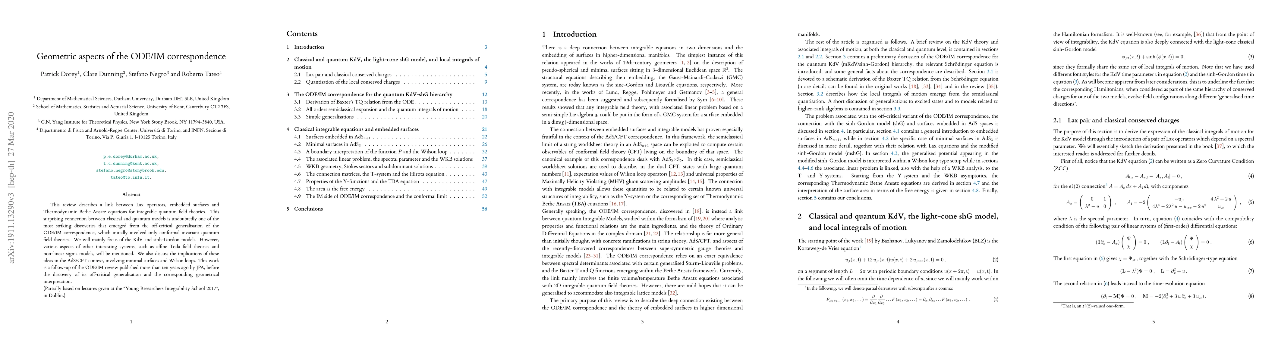 This paper reviews the geometric link between Lax operators, embedded surfaces, and the Thermodynamic Bethe Ansatz in integrable quantum field theories, focusing on KdV and sinh-Gordon models. It explores the implications of this off-critical ODE/IM correspondence in the context of AdS/CFT, involving minimal surfaces and Wilson loops.