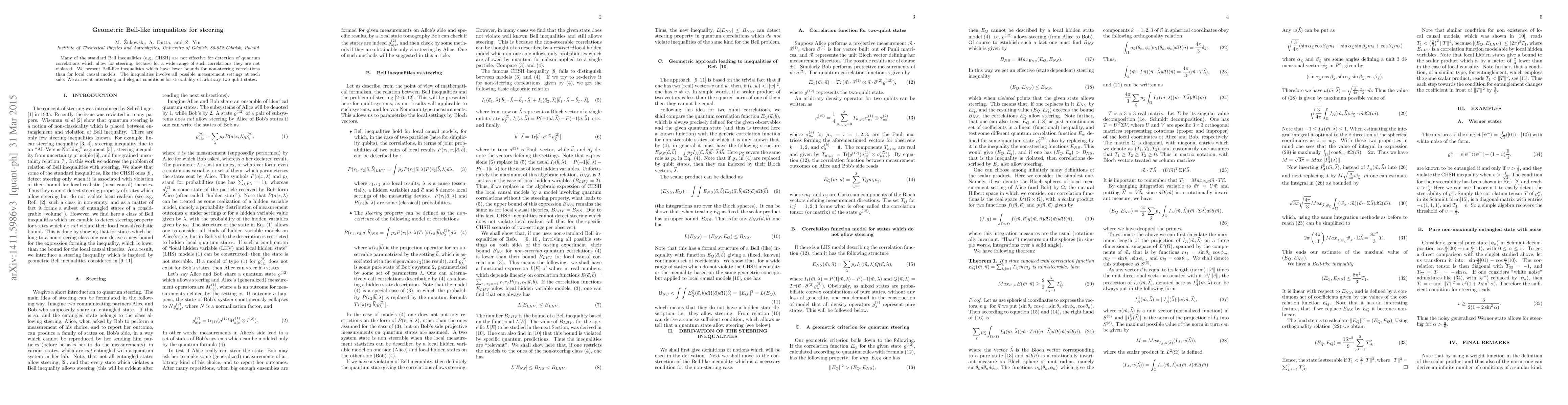 This paper introduces new geometric Bell-like inequalities that are more effective than standard ones for detecting quantum steering, providing tighter bounds for non-steering correlations and offering elegant conditions for determining the steerability of two-qubit states.