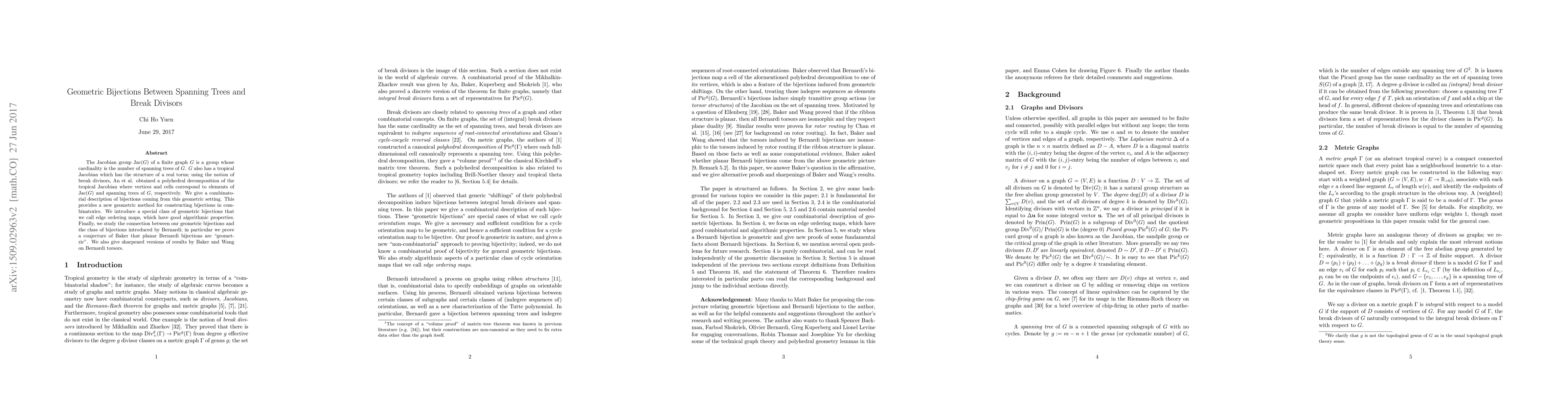 This paper establishes a geometric bijection between spanning trees of a graph and break divisors in its tropical Jacobian, introducing edge ordering maps with favorable algorithmic properties. It also confirms Baker's conjecture that planar Bernardi bijections are geometric, and refines results on Bernardi torsors.