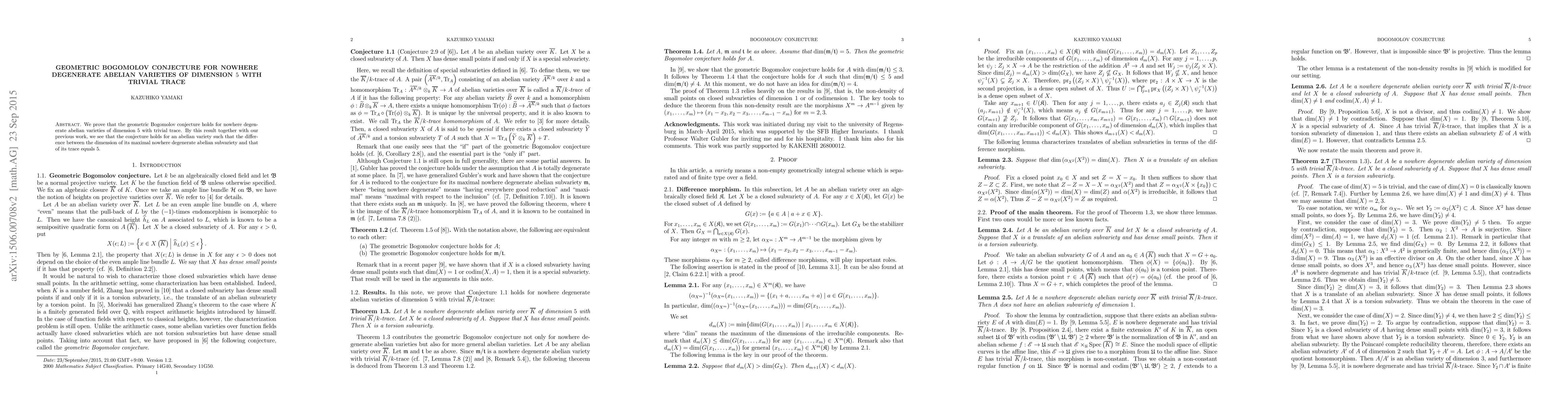 The paper proves the geometric Bogomolov conjecture for nowhere degenerate abelian varieties of dimension $5$ with trivial trace. This extends the conjecture's validity to cases where the dimension difference between the maximal nowhere degenerate subvariety and the trace is $5$.