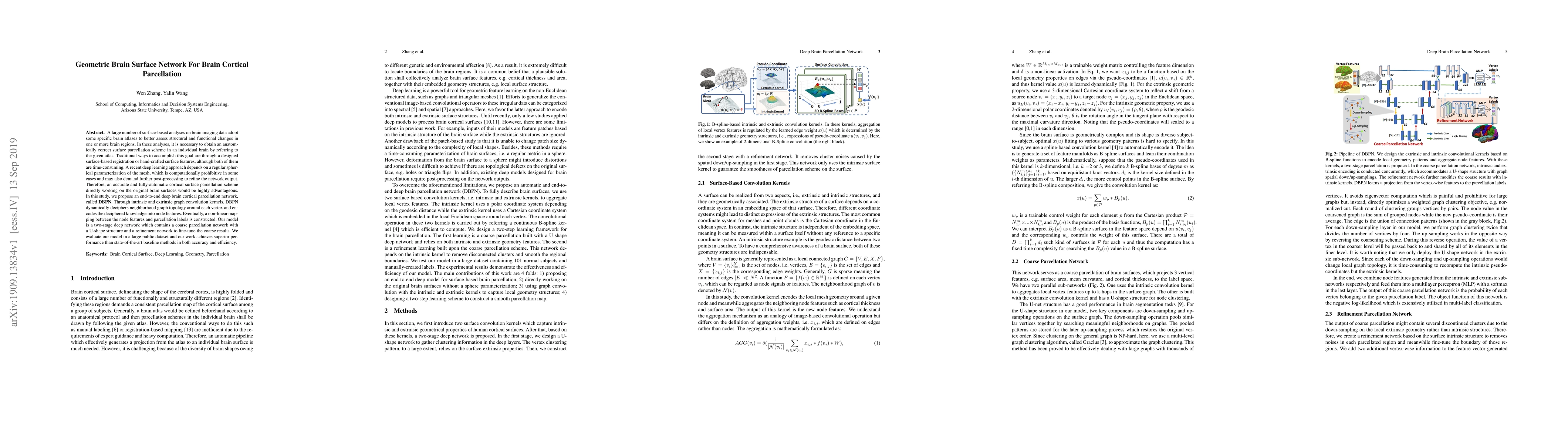 This paper proposes a deep brain cortical parcellation network (DBPN) that performs accurate and fully-automatic cortical surface parcellation directly on original brain surfaces. The DBPN uses intrinsic and extrinsic graph convolution kernels to dynamically decipher neighborhood graph topology, achieving superior performance compared to state-of-the-art methods in accuracy and efficiency.