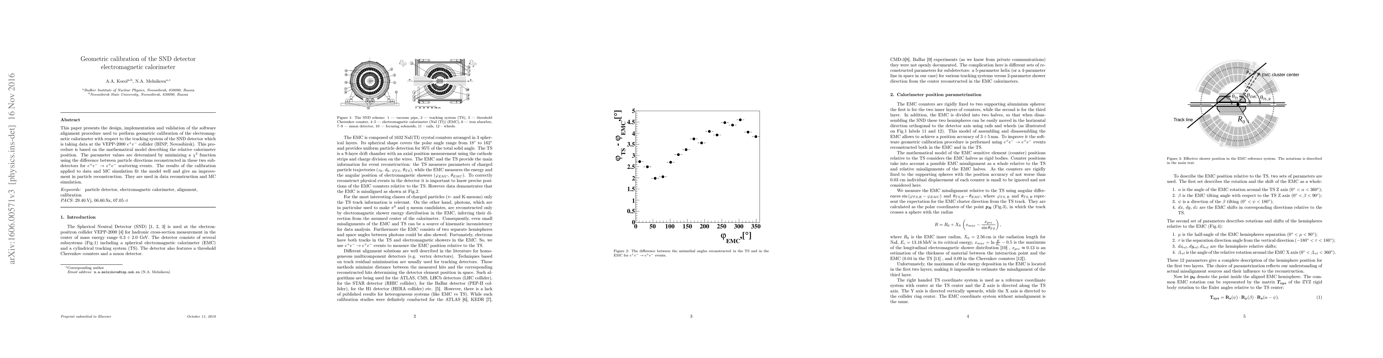 This paper details the geometric calibration of the SND detector's electromagnetic calorimeter using a software alignment procedure based on a mathematical model, which improves particle reconstruction accuracy by aligning it with the tracking system. The calibration results fit well with both data and MC simulation.