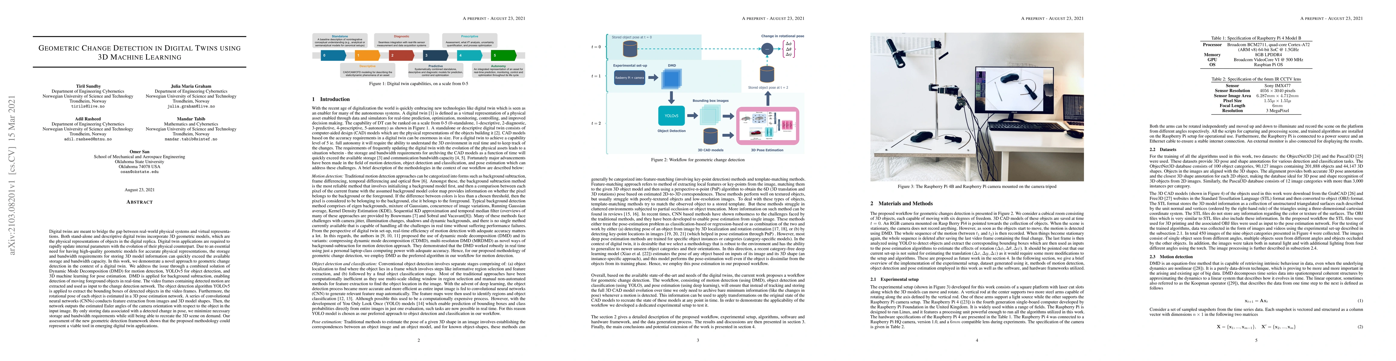 Digital twins are meant to bridge the gap between real-world physical systems and virtual representations. Both stand-alone and descriptive digital twins incorporate 3D geometric models, which are the physical representations of objects in the digital replica. Digital twin applications are required to rapidly update internal parameters with the evolution of their physical counterpart. Due to an essential need for having high-quality geometric models for accurate physical representations, the storage and bandwidth requirements for storing 3D model information can quickly exceed the available storage and bandwidth capacity. In this work, we demonstrate a novel approach to geometric change detection in the context of a digital twin. We address the issue through a combined solution of Dynamic Mode Decomposition (DMD) for motion detection, YOLOv5 for object detection, and 3D machine learning for pose estimation. DMD is applied for background subtraction, enabling detection of moving foreground objects in real-time. The video frames containing detected motion are extracted and used as input to the change detection network. The object detection algorithm YOLOv5 is applied to extract the bounding boxes of detected objects in the video frames. Furthermore, the rotational pose of each object is estimated in a 3D pose estimation network. A series of convolutional neural networks conducts feature extraction from images and 3D model shapes. Then, the network outputs the estimated Euler angles of the camera orientation with respect to the object in the input image. By only storing data associated with a detected change in pose, we minimize necessary storage and bandwidth requirements while still being able to recreate the 3D scene on demand.